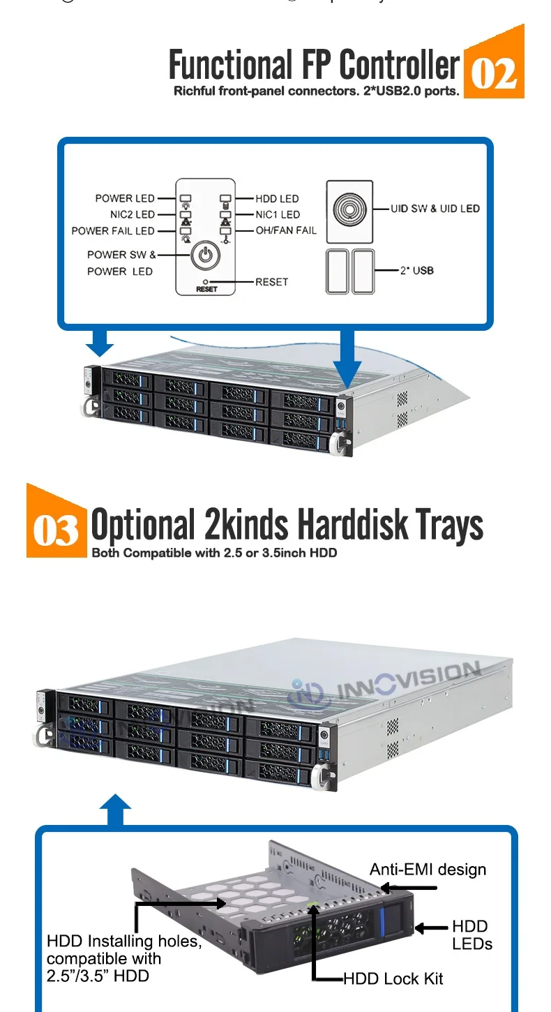 • 12 * отсеков привода с горячей заменой 3,5 "/2,5", 2*2,5 "отсеков внутри (задний вариант)