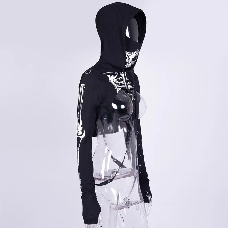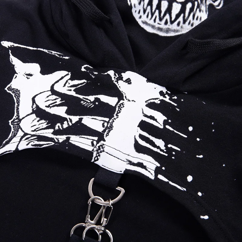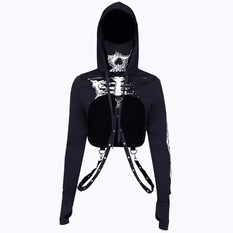 Женская модная черная Готическая толстовка с капюшоном и принтом черепа, укороченный топ с заклепками на бретелях, костюм для косплея
