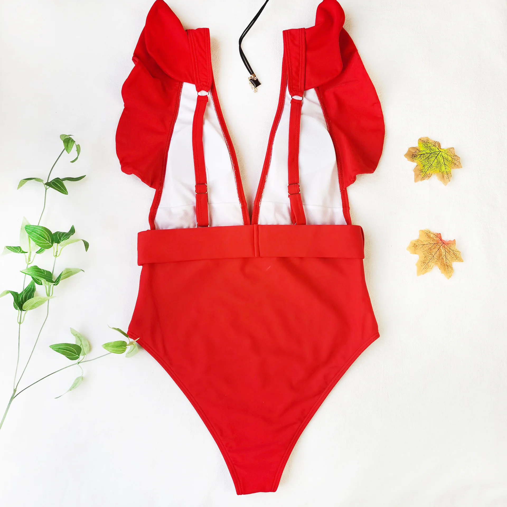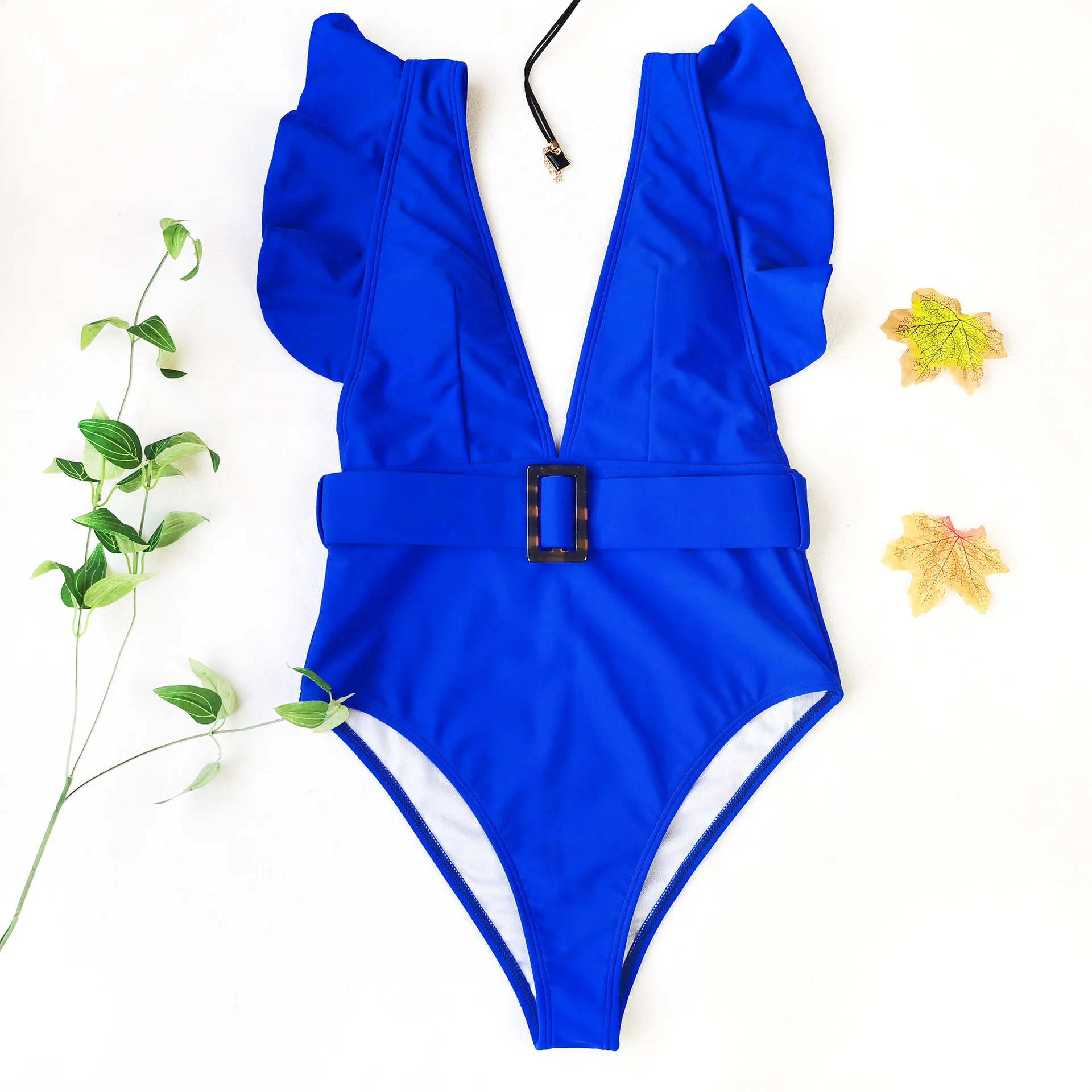 Белый купальный костюм, женский сексуальный Монокини с глубоким V-образным вырезом и оборками, женская одежда для плавания, сексуальный цельный купальник с поясом