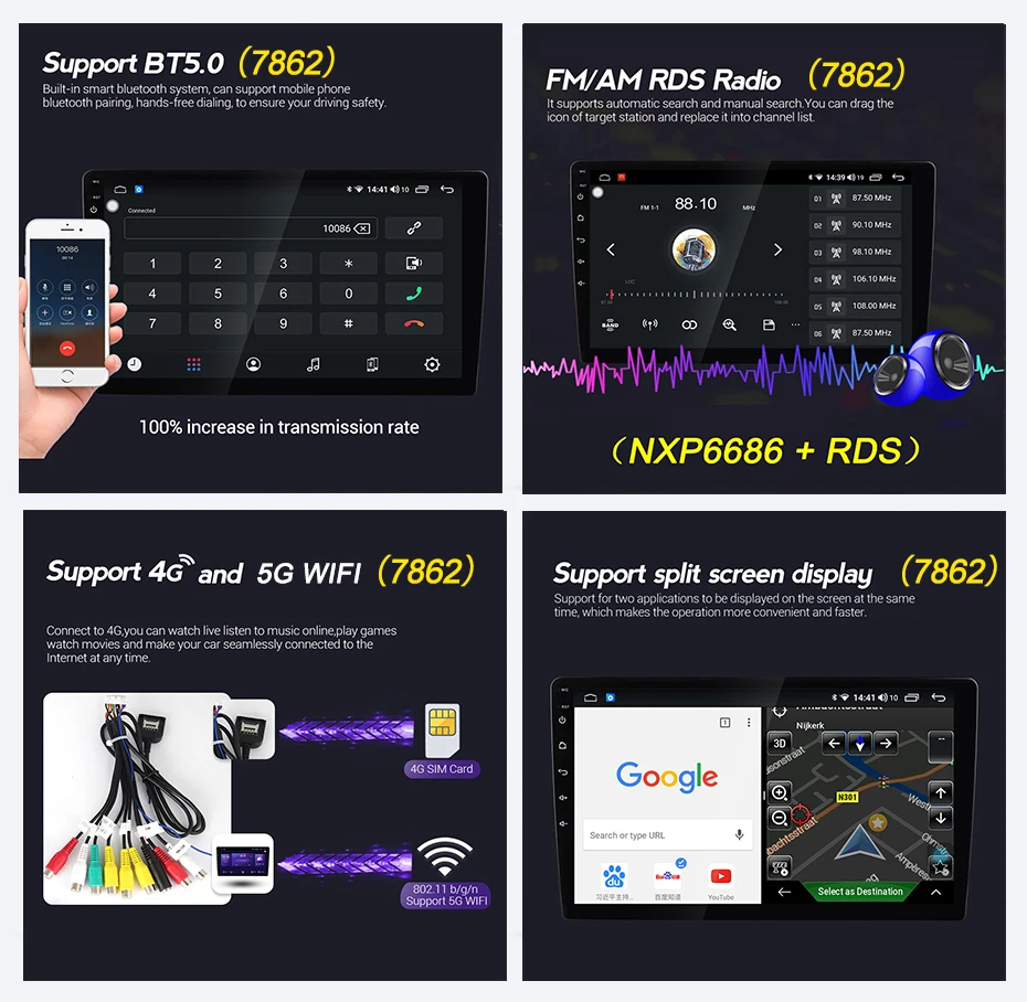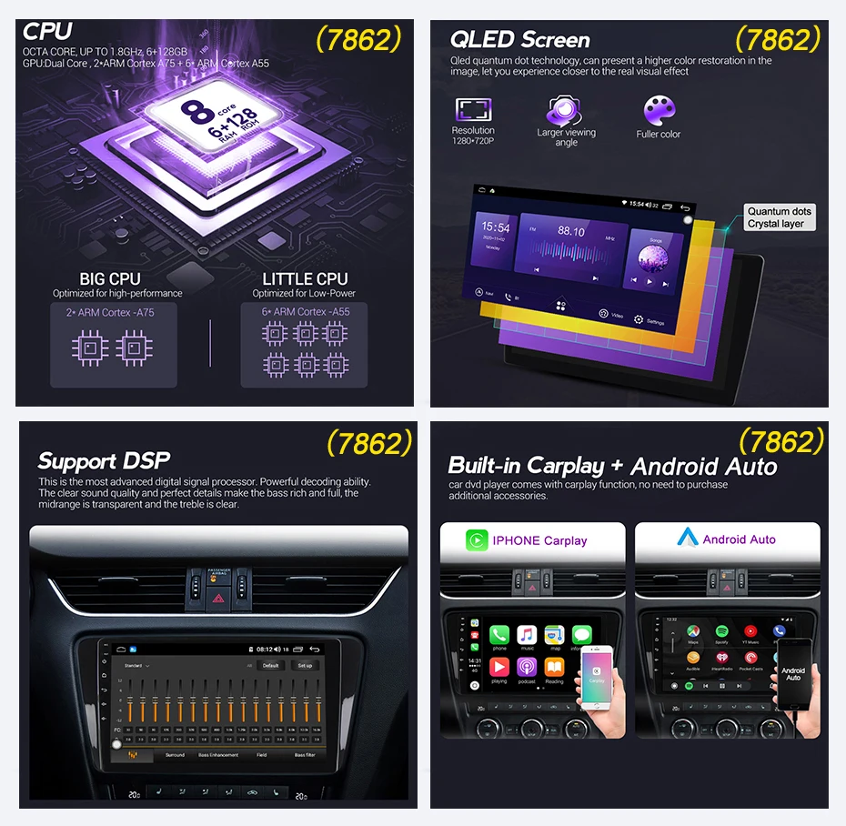 7862 лучший чип на рынке в настоящее время, он работает быстрее, чем все другие типы. Балл ANTUTU составляет 181063, что лучше, чем PX6, 9853 , PX5, MTK и всех других типов 4 + 64G на рынке. По сравнению с другими типами радио, радио 7862 может загружать больше видов приложений Android с Android market, и приложение может работать лучше.