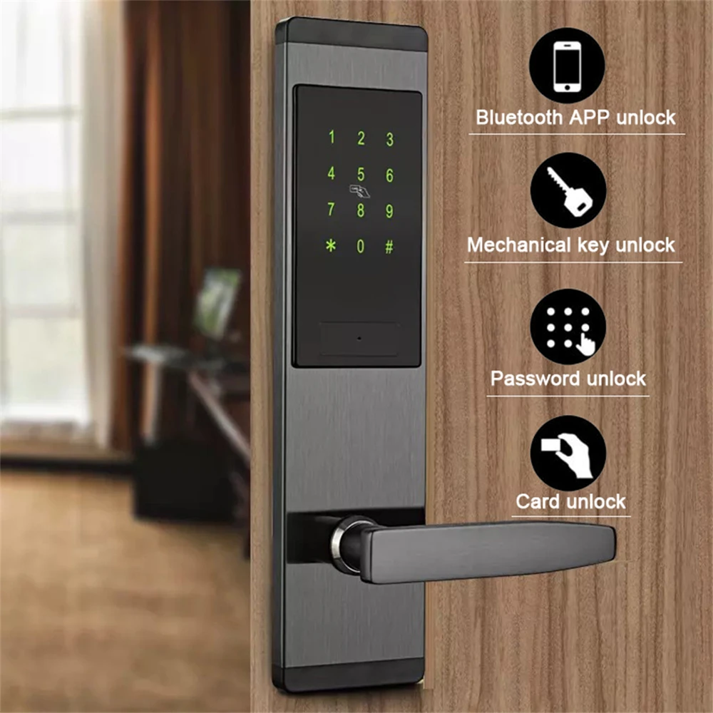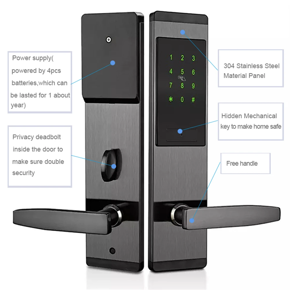 1. Метод разблокировки: приложение Bluetooth, пароль, RFID карта, разблокировка ключа2. Расстояние Bluetooth: Bluetooth в пределах 5 метров3. Внешний вид: краска для выпечки + покрытие4. Длина пароля: 6 цифр/поддерживает 16-значный манекен пароль5. Время работы в режиме ожидания: 13 месяцев (15 раз в день)6. Температура окружающей среды: -45 градусов-55 градусов7. Допустимая толщина двери: 38-55 мм8. Класс цилиндра: C9. Источник питания: 4 батарейки AA (не входят в комплект)10. Емкость карты: 50 листов11. Емкость пароля: неограниченный12. Количество паролей: заблокируйте пароль и будильник после 5 последовательных ошибок13. Функция системы: Управление приложениями/пароль старения/запрос записи14. Низкий уровень заряда батареи: низкомощный светильник по отпечатку пальца