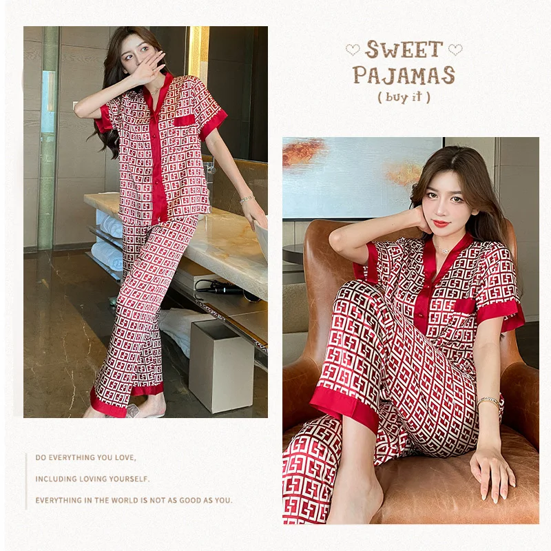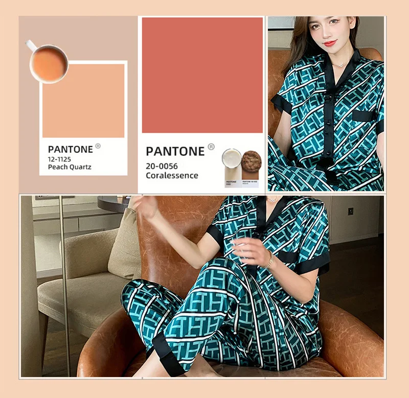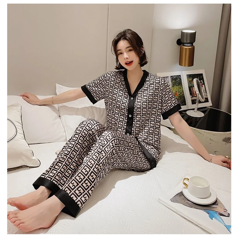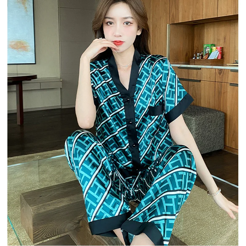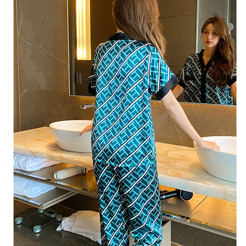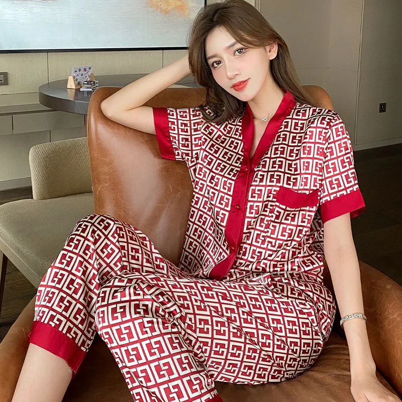 Пижама женская атласная с V-образным вырезом, роскошный Шелковый комплект для сна с узором, топ с коротким рукавом и длинные штаны, домашняя одежда