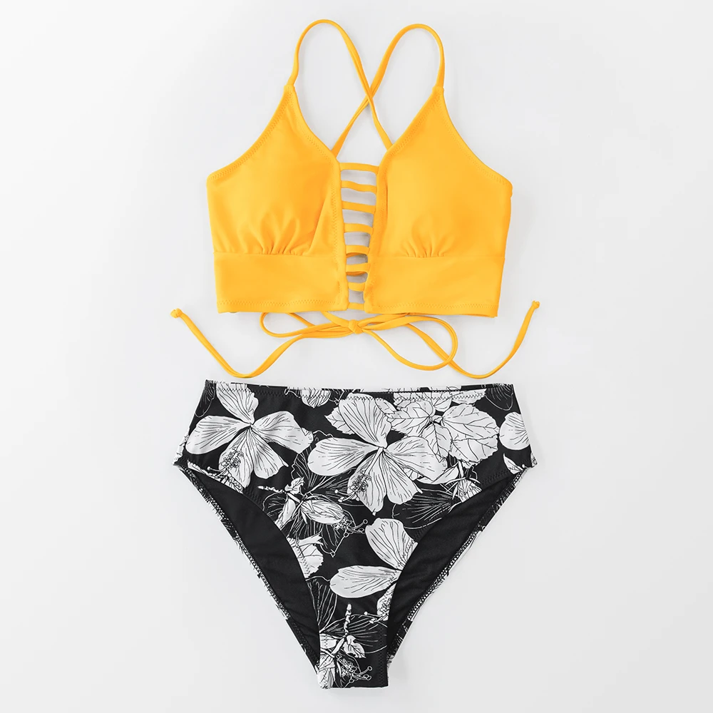 Купальник бикини женский желтый с цветочным принтом и высокой талией