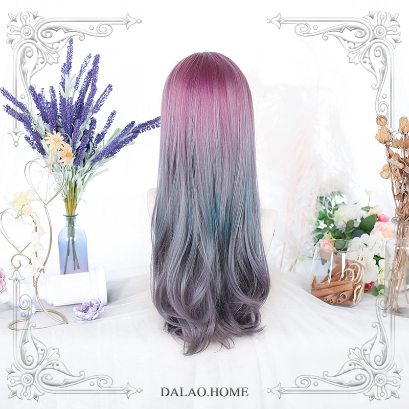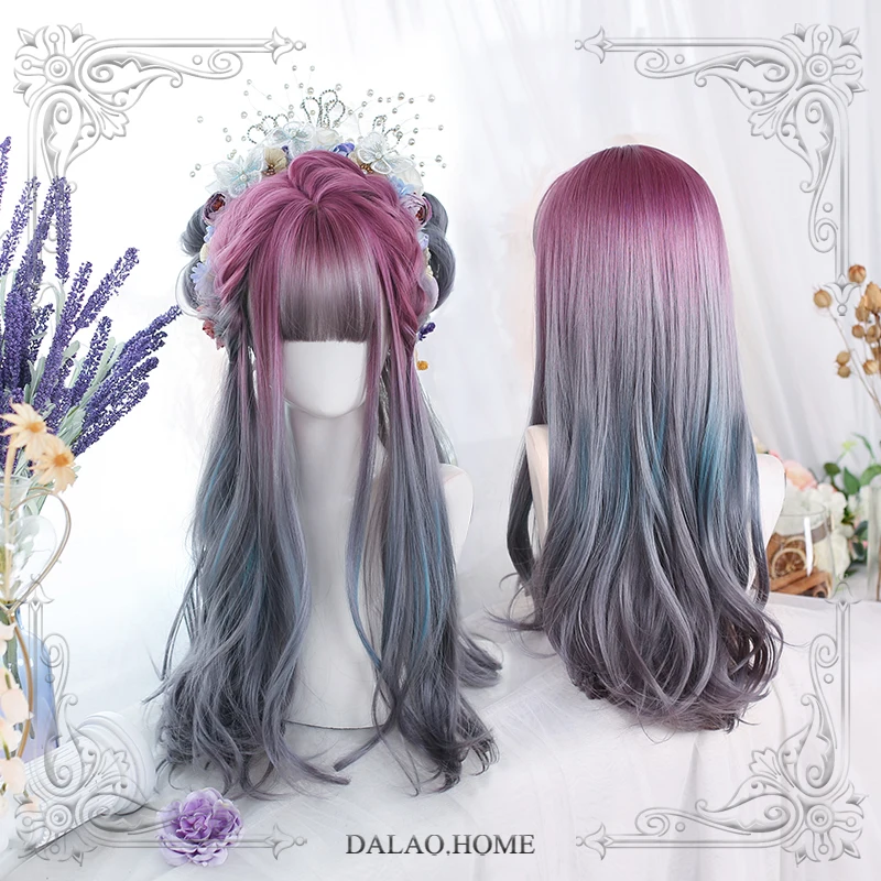 Парик в стиле лолита с градиентом фиолетового, серого, зеленого цветов, Волшебная челка для косплея в стиле Харадзюку, волнистые длинные милые волосы с бахромой для взрослых и девочек