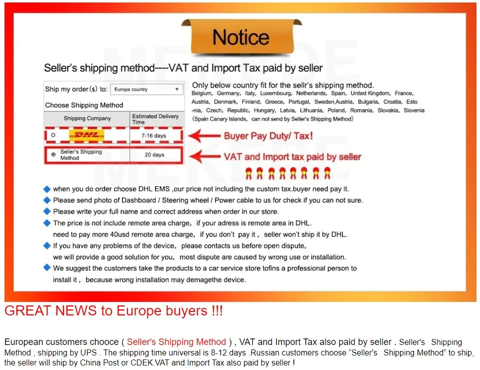 Таможенное оформление и налог на импорт1. Если есть таможенные пошлины, покупатели должны оплатить их. Если у вас есть специальный запрос, пожалуйста, свяжитесь с нами, когда вы делаете заказ.2. Импортные пошлины, налоги и сборы не включены в стоимость товара или стоимость доставки.3. Все посылки будут отправлены в течение 1-3 дней, как правило, после получения оплаты (за исключением выходных и праздников) Гарантия и возвратВсе наши товары проходят проверку 4 раза, чтобы подтвердить работоспособность должным образом перед отправкой и приходят с 12-месячной пожалуйста, будьте уверены, купите у нас. Гарантия не будет покрывать ущерб от неправильной установки, несчастного случая, неправильного использования, неправильного использования, неправильной проводки и неправильного напряжения, работающего на устройстве, в соответствии с инструкциями, приведенными в руководстве владельца.Время проверки для замены составляет 14 дней с даты получения товара, если у этого товара есть какие-либо проблемы при прибытии, пожалуйста, свяжитесь с нами и обратите внимание, что он находится в первоначальном состоянии.Покупатель несет ответственность за оплату почтовых расходов и отправку товара обратно к нам. Пожалуйста, сообщите нам причину отзыва вашего заказа и отправьте нам четкое изображение или видео в качестве доказательства. Товары, возвращенные нам без отчета, не будут обработаны. Установка:Пожалуйста, просто установите этот блок профессиональным техником, также попросите их проверить его перед установкойПеред отправкой мы тщательно проверили все наши товары, если вы получили сломанный дефектный товар, Просто сохраните оригинальную посылка и сделайте фотографию нам в течение 3 дней Примечание:Сборы за установку не контролируются нами, они должны быть оплачены покупателем.Цена не включает НДС и таможенный налог, если возникают какие-либо сборы, покупатель должен оплатить их самостоятельноПокупатель несет ответственность за транспортные расходы, связанные с возвратом товаров Отзывы:Мы установили автоматическую систему для отзывы, когда получите ваши отзывы; Она даст вам такую же автоматическую, она будет оценена, если вы можете оставить нам положительный отзывы с 5 звездами, это ободрение для нас, и мы сделаем все лучше. Если вы не оставите нам негативные отзывы и не открываете спор. Мы всегда предоставляем обновленную прошивку. Не стесняйтесь обращаться к нам в любое время до и после покупки; Мы стремимся к 100% удовлетворенности клиентов.