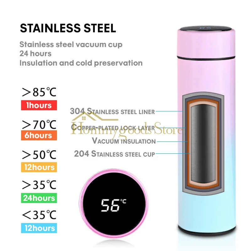 Особенности 1. Портативный и прочный. Идеально подходит для путешествий, активного отдыха, автомобиля, офиса, дома, школы, пикника, горячих йога, пеших прогулок, кемпинга и т. д. 2. С сенсорным ЖК-экраном HD для быстрого отображения температуры воды в реальном времени. Позвольте вам пить воду, которая наиболее подходит для температуры в любое время и в любом месте. 3. Изготовлен из нержавеющей стали 304, двухслойный вакуумный дизайн, безопасный, без BPA и экологически чистый, без запаха и легко моется. Он может держать горячую или холодную воду в течение 12 часов. 4. Эта Вакуумная бутылка для воды также является хорошим контейнером для кофе, соковыжималки, молока, пива, напитков и ежедневного увлажнения. Лучший подарок для семьи и друзей. Подарок на день рождения, подарок на день Святого Валентина-хороший выбор. Спецификация: Емкость: 500 мл Материал: нержавеющая сталь 304 Посылка включает в себя: 1 термос