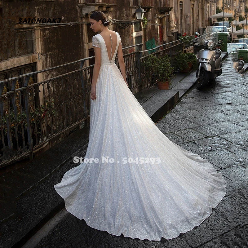 Блестящее свадебное платье цвета шампанского с коротким рукавом, бл...