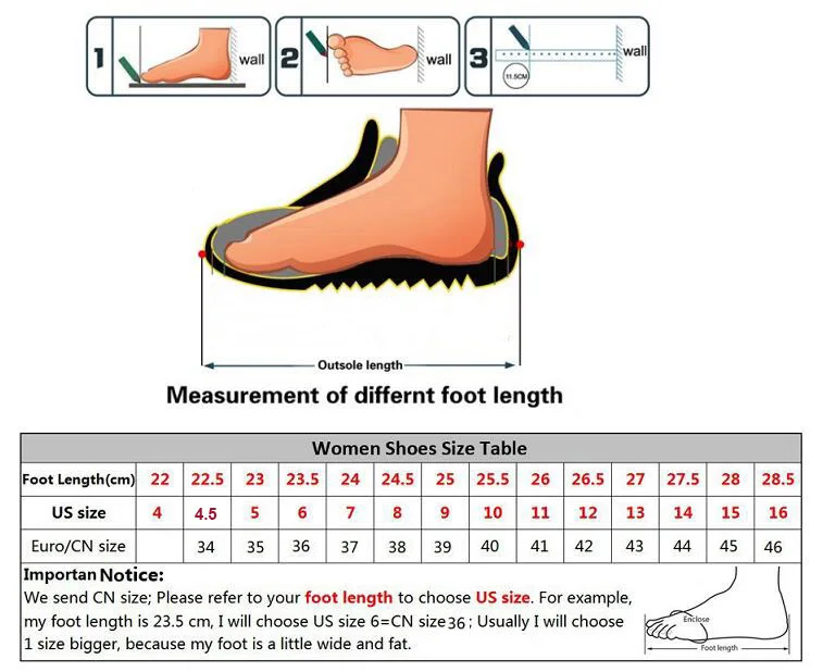 Пожалуйста, измерьте длину вашей стопы и следуйте нашей таблице размеров. , Если вы предпочитаете свободный размер, или если у вас широкая стопа, мы предлагаем взять на один размер больше. Наш размер отличается от других магазинов обуви, пожалуйста, внимательно изучите нашу таблицу размеров.
