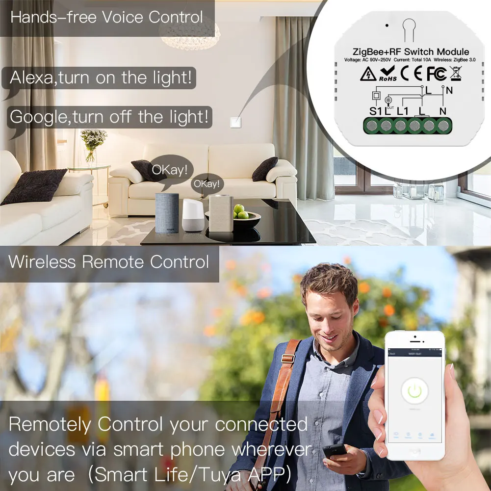 1 бандаРабота с Alexa Google HomeПриложение: Smart Life/TuyaКонцентратор Tuya Zigbee необходим для нормального использования этого переключателя.Поддерживает только сеть 2,4G;Особенности:1. Тем временем подходит для сброса и перекидного выключателя2. Пульт дистанционного управления RF433 / App. (Примечание: пульт дистанционного управления RF433 не входит в посылка, и вам нужна самостоятельная покупка.)3. Мульти-контроль в гораздо более простой способ4: новый режим сопряжения с ZigBee.5: функция отключения памяти.6. Этот умный wifi модуль с мини-дизайном подходит для ЕС/настенный переключатель стандарта Великобритании коробки.