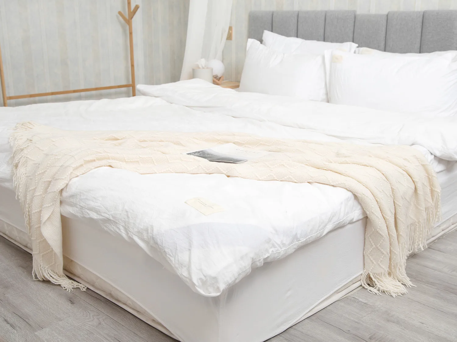 Бежевое вязаное одеяло в скандинавском стиле для дивана, плед с кис...