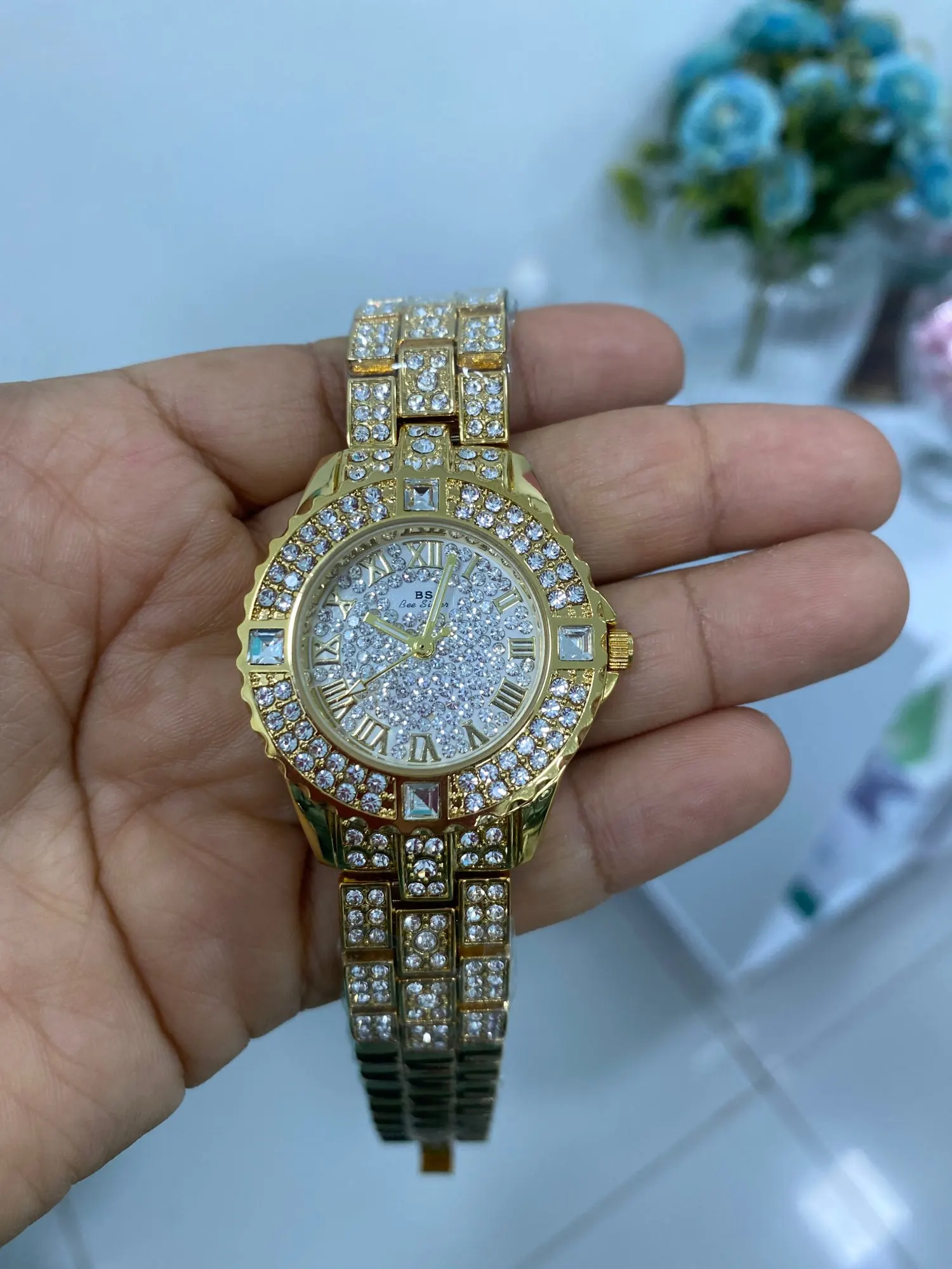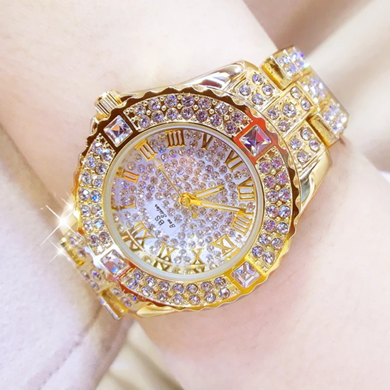 Часы наручные стразы женские с бриллиантами, брендовые роскошные золотистые, с браслетом