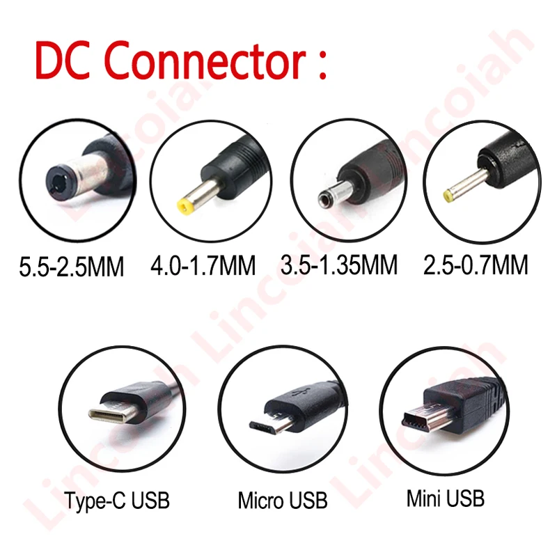 Штекером постоянного тока для подключения к: 5,5*2,5 мм, 4,0*1,7 мм, 3,5*1,35 мм, 2,5*0,7 мм, Micro Usb,Mini Usb
