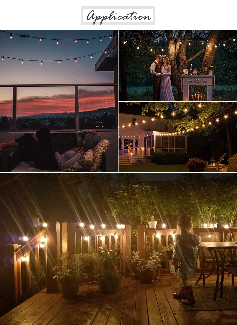 Оснащен 25 Глобальный светильник лампы с E12 базы, G40 строка светильник издает ярко-желтое свечение на задних дворов, беседок, садов, пергол, палуб, городских крыш, держащих букет невесты на свадьбе, званых обедов, вечеринок по случаю Дня рождения, посиделок мгновенно светильник на ваши места в романтическом, тем не менее, праздничный способами.Супер обновленный энергоэффективный яркий светильник с водонепроницаемым освещением делает его идеальным для использования на открытом воздухе или в помещении.Применение:Гирлянда для патио, Рождественские декоративные огни, праздничные огни и зонтичные огни, свадебный фон, отели и рестораны, коммерческие, бытовые, витрины, клубы, концерты, караоке, модные шоу, танцевальный зал, И так далее.