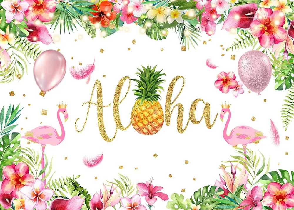 Фон для детского дня рождения с Тропическими Цветами и зелеными листьями