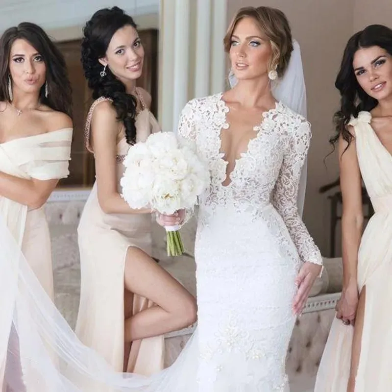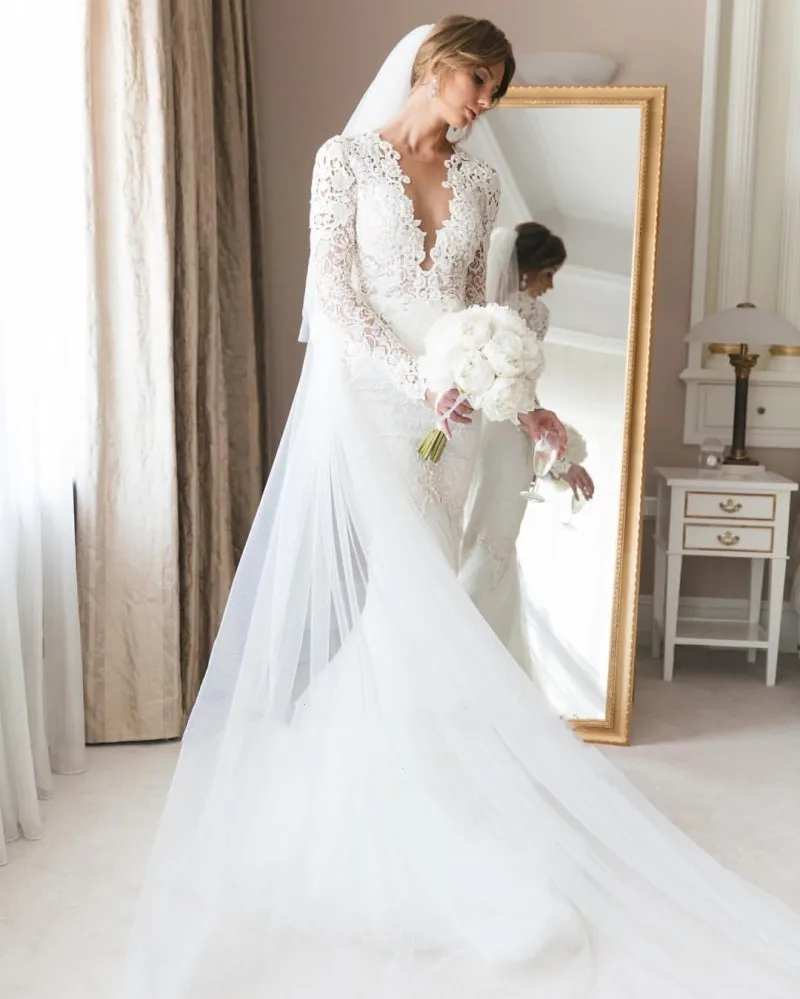 Кружевное свадебное платье-русалка, белое элегантное винтажное платье невесты с глубоким V-образным вырезом и длинными рукавами, на заказ