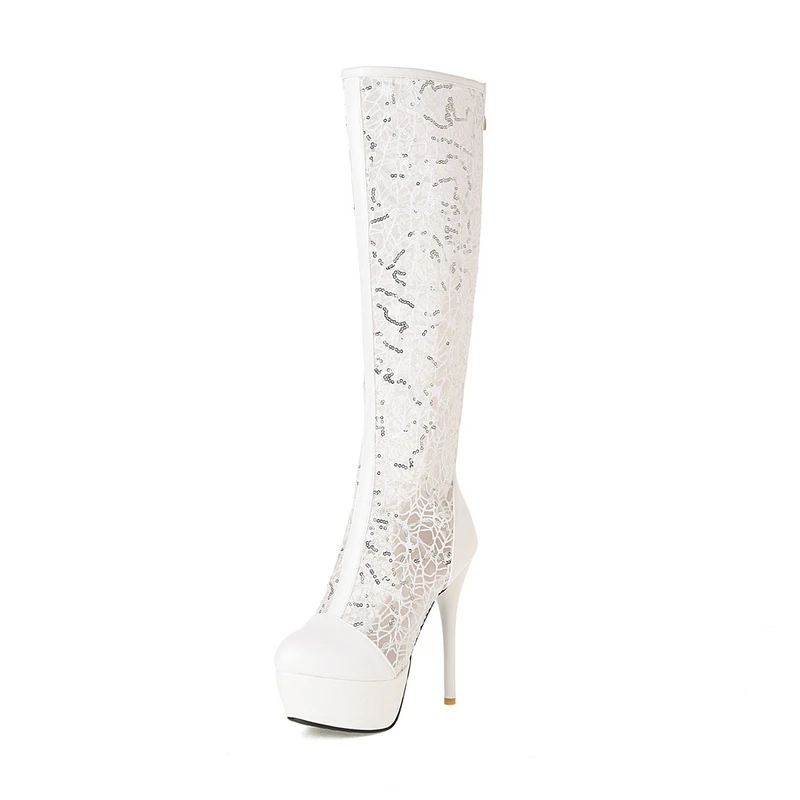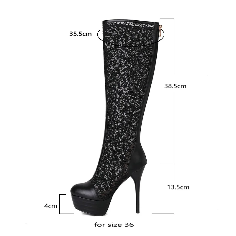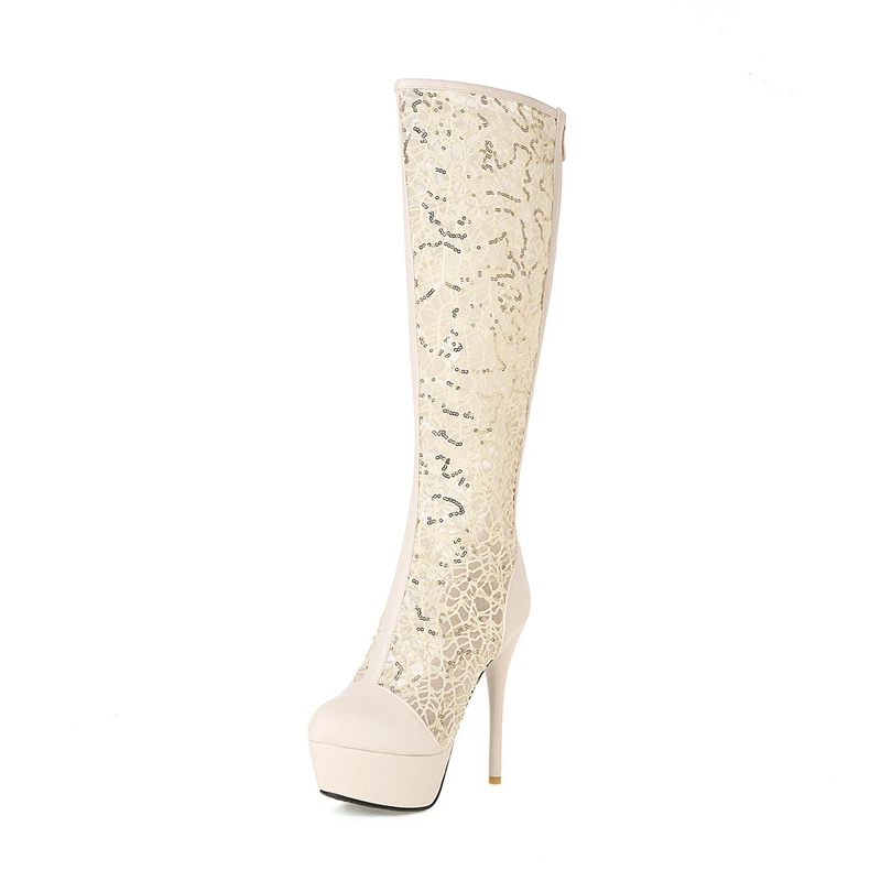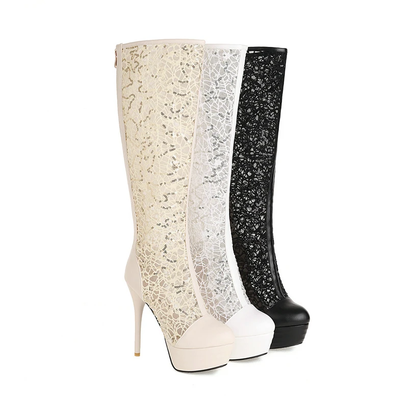 Женские сапоги до колена, черные, персиковые, белые высокие сапоги на платформе и тонком высоком каблуке, сетчатые сапоги на молнии сзади для лета
