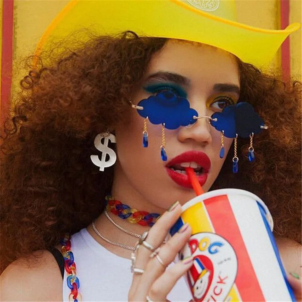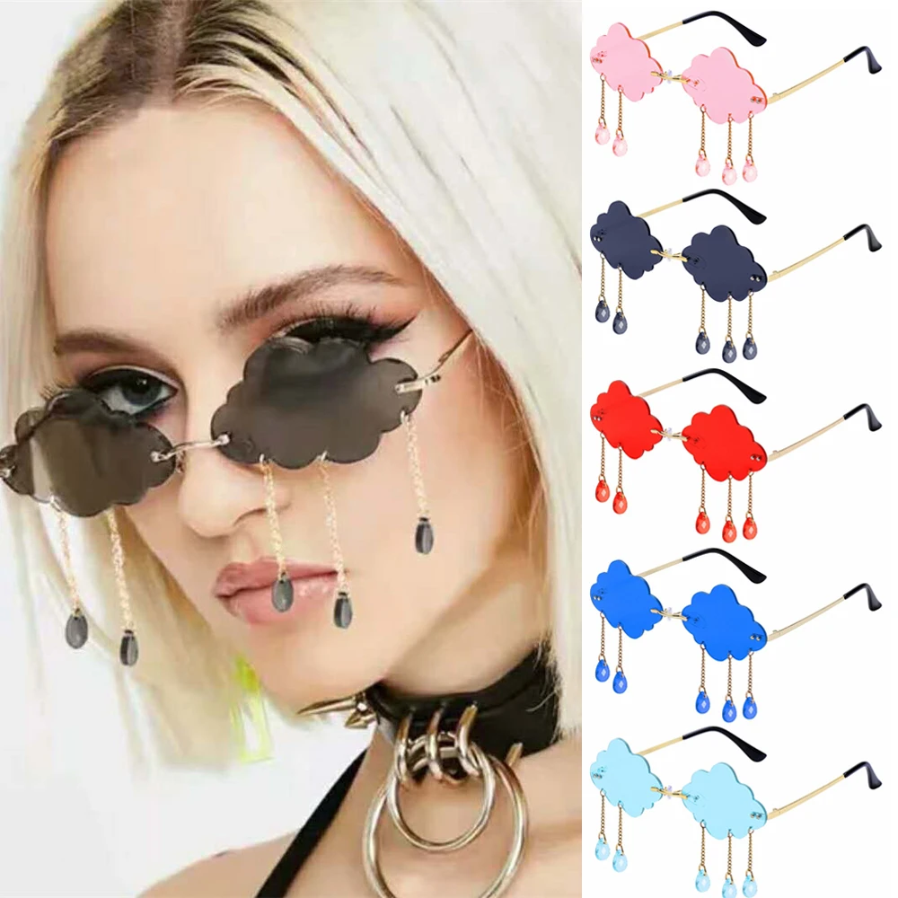 Креативный дизайн солнцезащитных очков с облаками: дизайн солнцезащитных очков без оправы принимает изображение дождя на облаках, которое сопоставлено с глазами человека и представляет уникальную красоту. Бриллиантовый кулон с кисточками свисает с глаз, надвигаясь, как глаза богини. Подходит для фотографирования, Инс стиль, вечерние выпускного вечера, украшения для макияжа, одежда acce ssories. Солнцезащитные очки с кисточками в виде облаков и бриллиантов по-разному одевают вашу красоту.