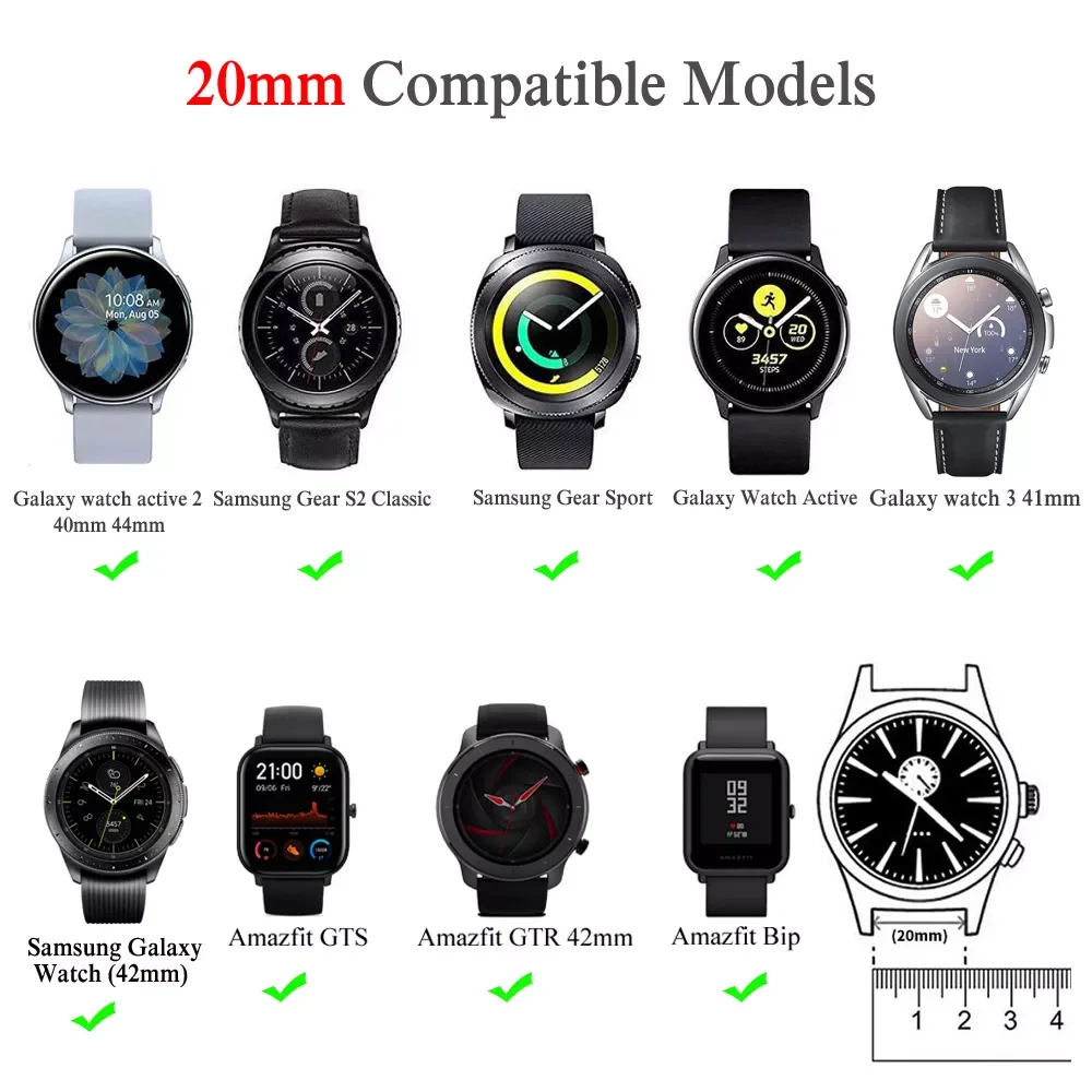 Описание товара Мягкость умеренная, удобно носить. Компрессионная формовка, прочная и долговечная Материал: силикон Длина браслета: 85 мм. Длина браслета: 120 мм. Известные наручные Размеры: 5,5 "-8,1" (20 мм) Совместимые модели: Для samsung galaxy watch 3 41 мм Для Samsung Galaxy watch active 2 40 мм 44 мм Для Samsung Gear S2 Classic Для Samsung Gear Sport Для Samsung Galaxy Watch Active Для Samsung Galaxy Watch 42 мм Для Huawei Watch 2 Для Huawei Watch GT 2 42 мм Для Huawei Honor Magic Watch 2 42 мм Для Huami Amazfit BIP youth Для Huami Amazfit BIP lite Для Huami Amazfit GTR 42 мм Для Huami Amazfit GTS