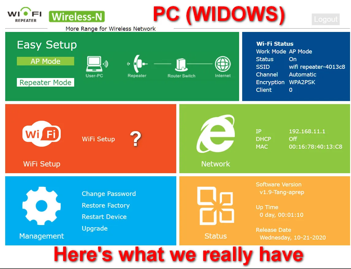 Заказ отримав доволі швидко. Меню в приладі трохи урізане, немає тонких налаштувань (дивіться фото). Але найгірше, що у режимі AP неможливо змінити SSID та пароль доступу. Продавець запропонував вислати другий пристрій безкоштовно. Сподіваюся, в ньому буде все гаразд.