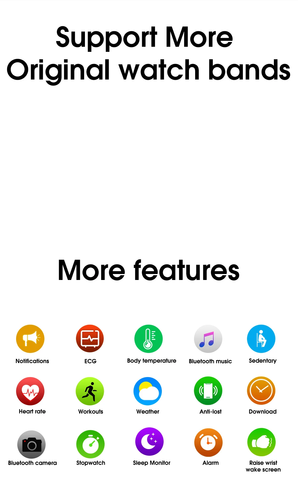 Температура тела, загрузка циферблата, частота сердечных сокращений, ЭКГ, кровяное давление, уровень кислорода в крови, шагомер, секундомер, Bluetooth камера, Bluetooth управление музыкой