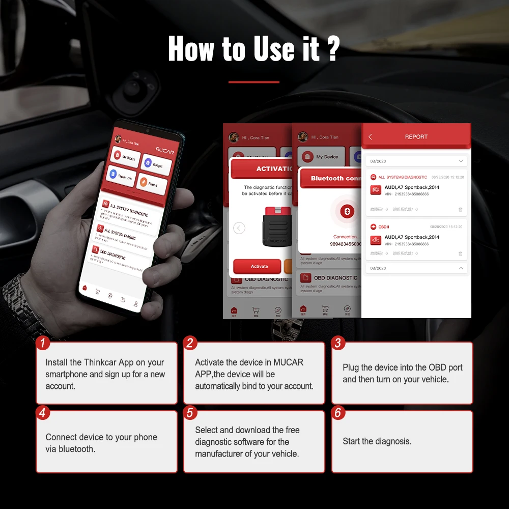 1. Установите приложение MUCAR на свой смартфон и Зарегистрируйтесь на новую учетную запись.2. Активируйте устройство в приложении MUCAR, устройство будет автоматически привязываться к вашей учетной записи.3. Подключите устройство к порту OBD, а затем включите транспортное средство.4. Подключите устройство к телефону через bluetooth.5. Выберите и загрузите бесплатное диагностическое программное обеспечение для производителя вашего автомобиля.6. Начните диагностику.