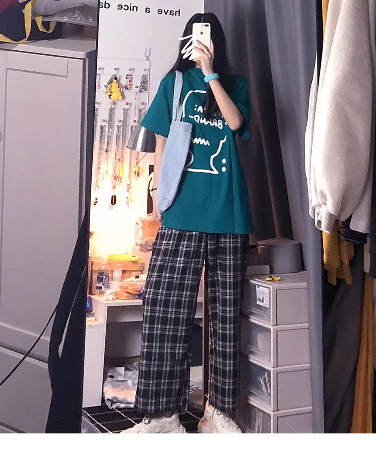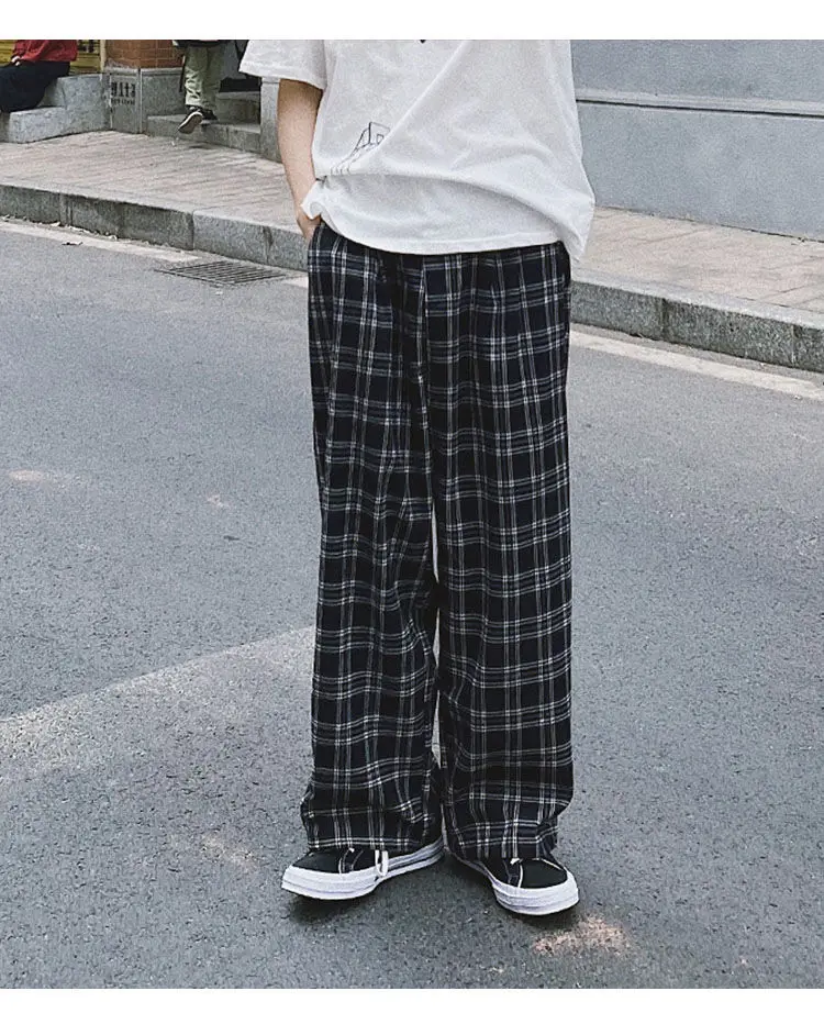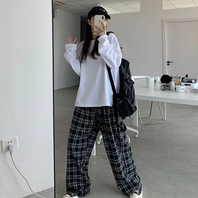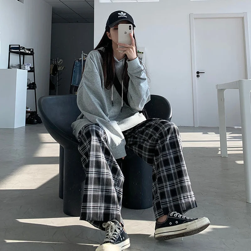 Брюки женские клетчатые с завышенной талией, модные длинные свободные брюки с широкими штанинами в Корейском стиле, повседневная универсальная уличная одежда, винтажные штаны