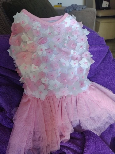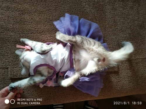 Красивое легкое платье. В подарок продавец заколку положил. Сшито качественно, нитки не торчат. Ничем не пахнет. С размером не угадала, очень большое, кошка 3,5 месяца за секунду из него вылезает, еле успела сфотографировать. На вырост пойдет как раз. Доставка в Москву 14 дней.