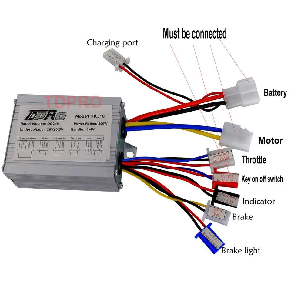 Напряжение Ted: 24 В Номинальная мощность: 500 Вт В соответствии с Напряжение защиты: 20V ± 0,5 V Предел тока: 28 ± 1A Полезный Двигатель: 24V500 Вт Регулятор скорости 1-4 в (дроссельная заслонка) Условия эксплуатации: -25 -- 45 Функция: Этот товар подходит для электрического велосипеда и скутера Контроллер щетки двигателя. Разъем: 1. Красный и черный (большой кабель): подключение батареи 2. Желтый и синий: соединения двигателя 3. Красный и синий: клавишный переключатель (Блокировка питания) (Если нет дверных замков питания, красное соединение с синим) 4. Желтый и черный: тормоз 5. Красный и желтый: тормозной светильник 6. Красный и черный (маленький кабель): световой светильник 7. Красный, черный и синий: регулятор скорости 1-4 в (дроссельная заслонка) (Красный: + 5 В, черный: - , синий: сигнальный провод) 8. Красный и черный (маленький кабель): зарядное устройство