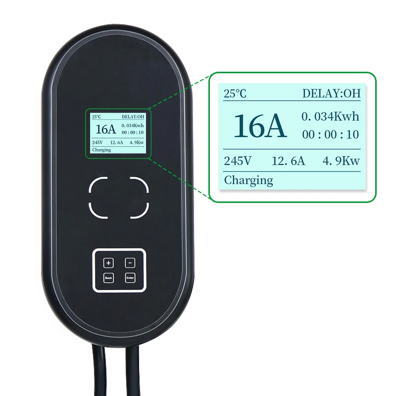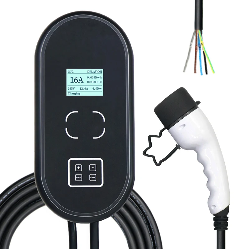 1.16A/32 A, 240 В, 3.6 кВт/7.2 кВт/11 кВт/22 кВт, уровень 2 домашняя зарядная станция EV.2. Простота в использовании, не нужно приложение для его запуска или подключения к домашней сети.3. Станция использует пластик и АБС-пластик, чтобы быть прочнее. Режим пуска кнопки и простая установка.4. ЖК-дисплей для отображения всех данных автомобиля на зарядной станции во время зарядки. Вы можете увидеть состояние зарядки, включая ток, напряжение и температуру. Винты помещаются в коробку, поэтому вам не придется беспокоиться о падении экрана.5. Кабель 5 м оставляет достаточно места между вашим автомобилем и зарядной станцией.