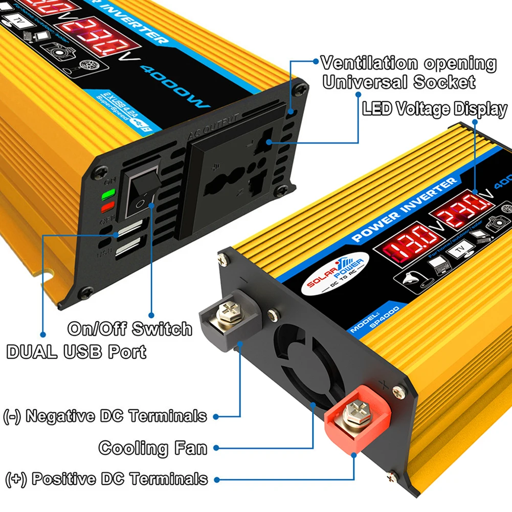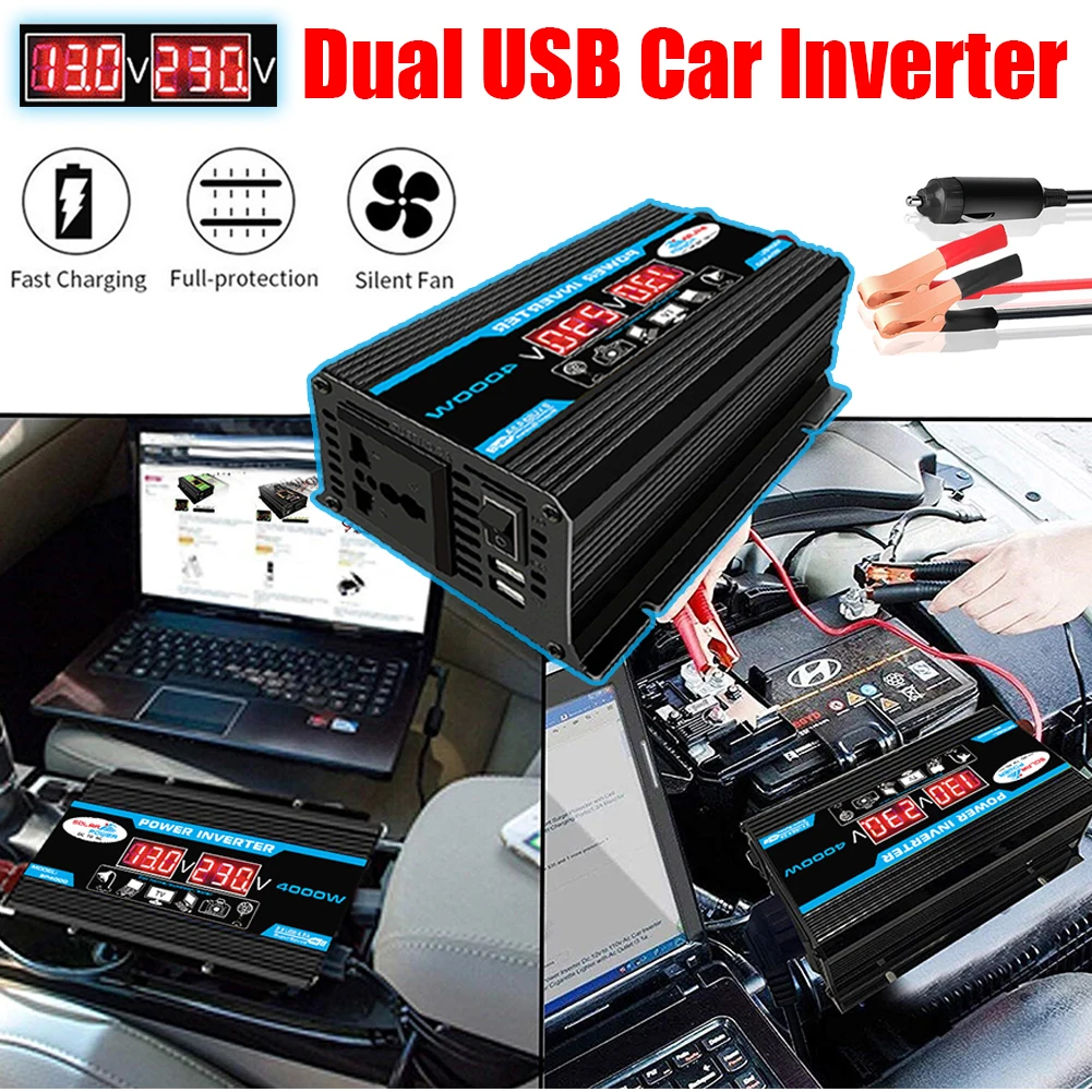 Автомобильный преобразователь напряжения с ЖК-дисплеем, зарядное устройство 4000 Вт от 12 В до 220 В110 В, трансформатор напряжения с двумя USB-портами, модифицированный синусоидальный автомобильный трансформатор переменного тока