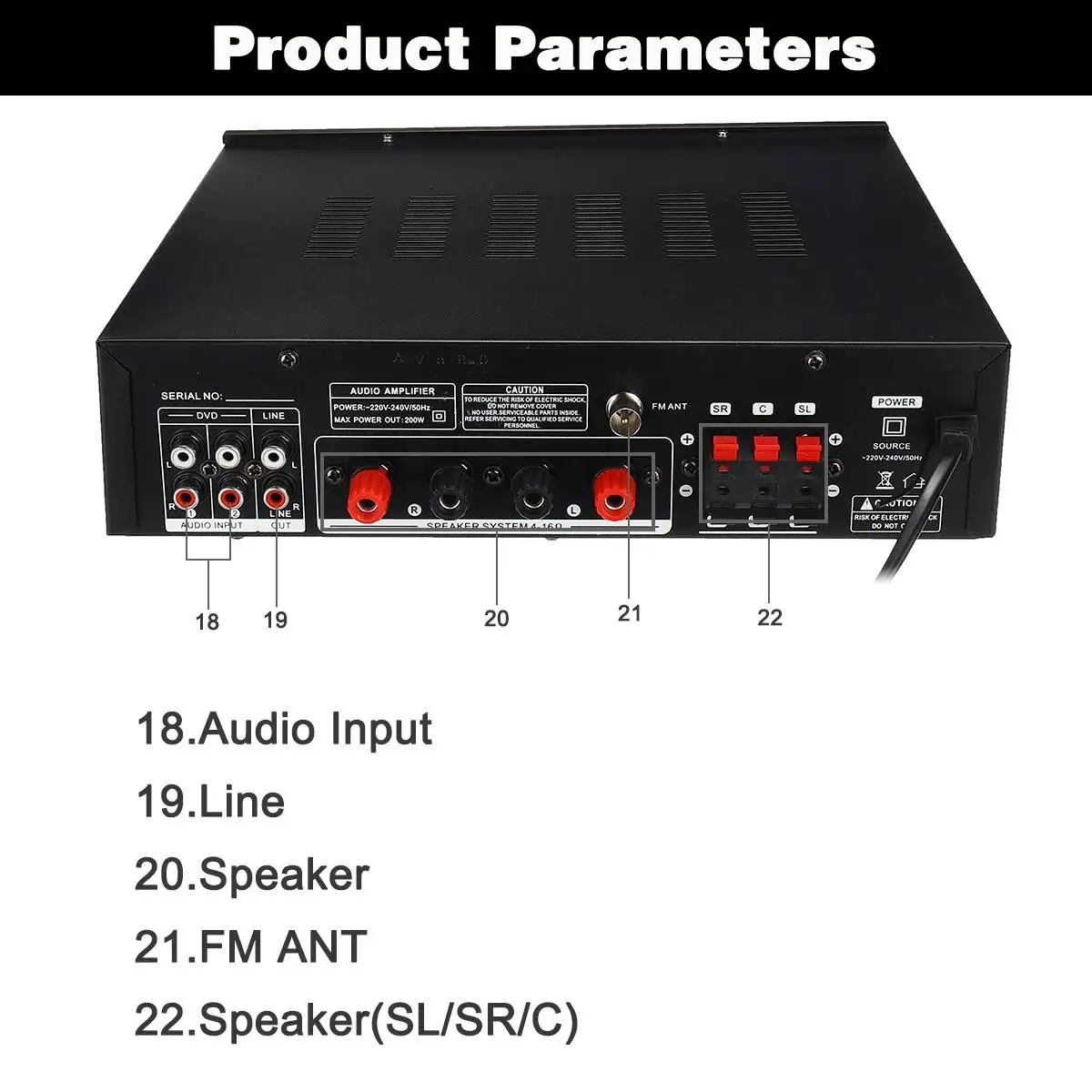 Особенность:1.5.0 усилитель подключения динамика с радиоМаксимальная производительность 2,800 Вт3. Регулируемая громкость микрофона4. Поставляется с пультом дистанционного управления6. Светодиодный дисплей8. Поддержка FM-радио.