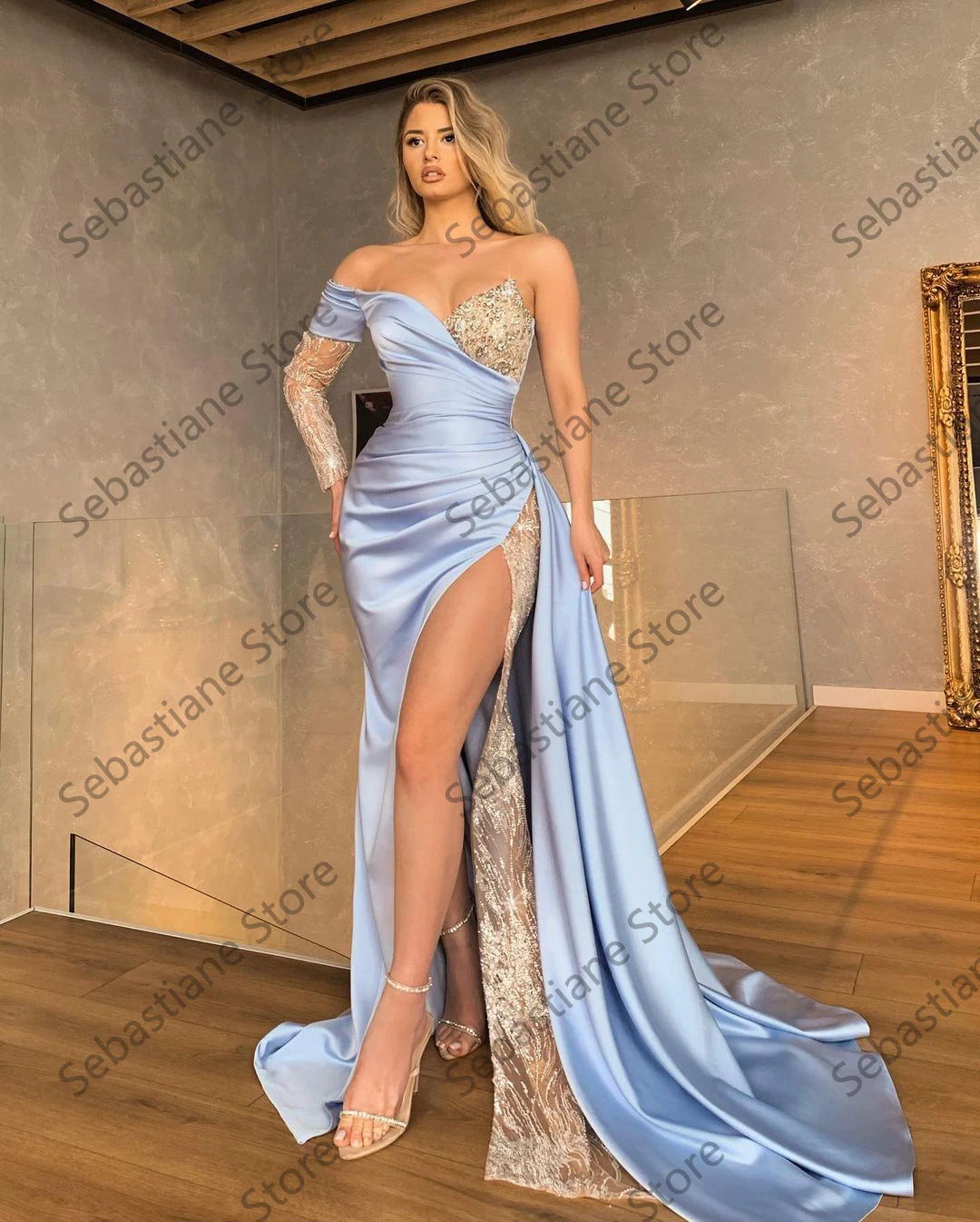 Сексуальные синие вечерние платья на одно плечо с длинным рукавом сердечком с разрезом по бокам, кружевные бусины, длинные платья для выпускного вечера, на заказ