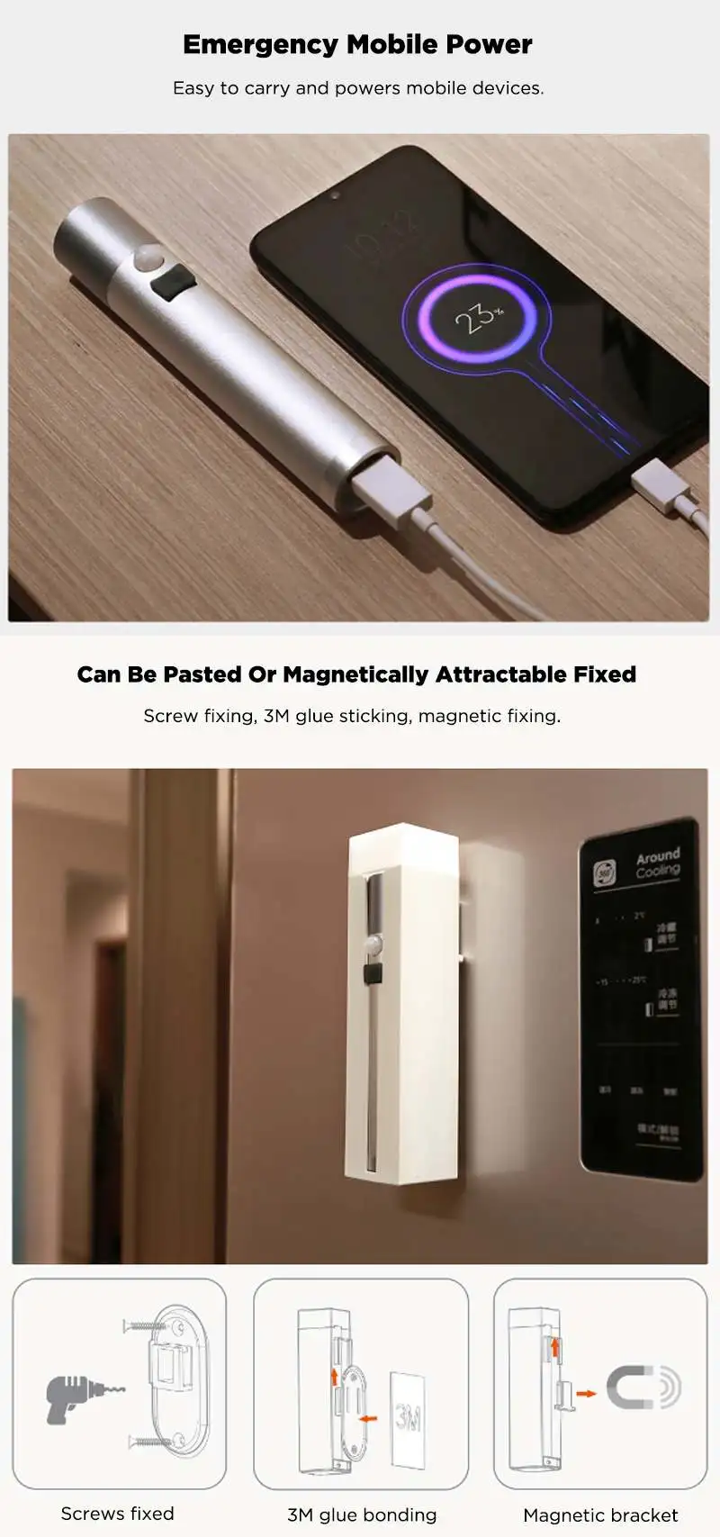 -Магнитная настенная лампа как ночной светильник.-Выход как внешний аккумулятор-USB или просто необходимо поместить в держатель лампы для автоматической зарядкиПосылка включает в себя:1 х Многофункциональный индукционный фонарик1 x подставка для лампыКомплект для установки настенной лампы-1 шт.1 х USB кабель