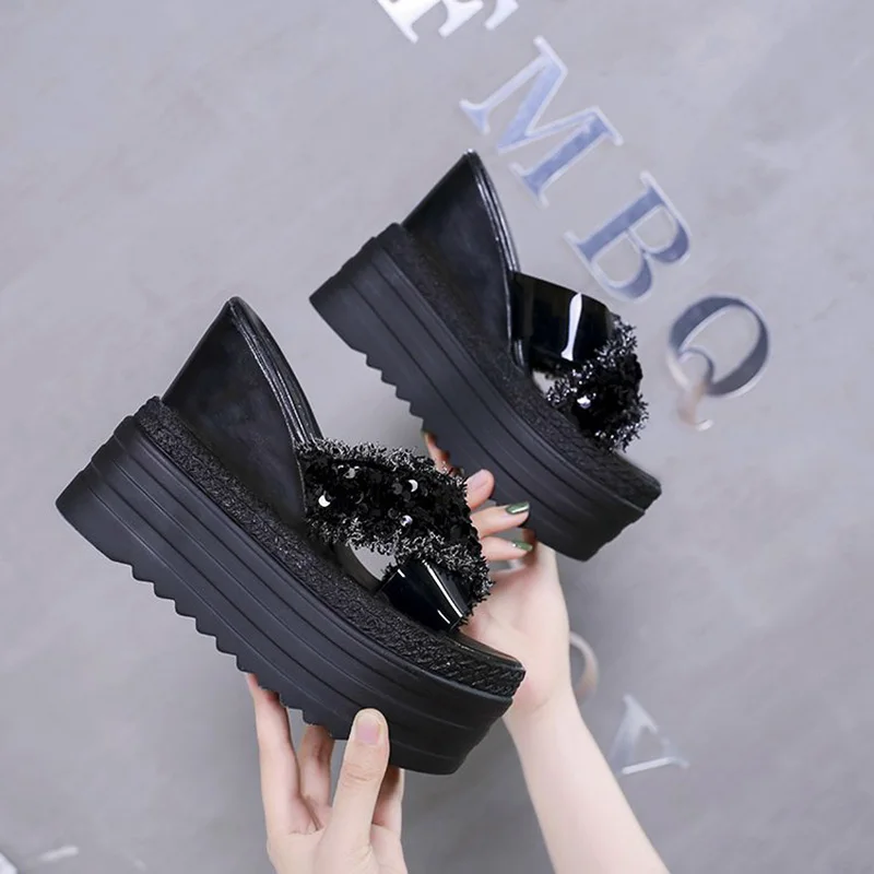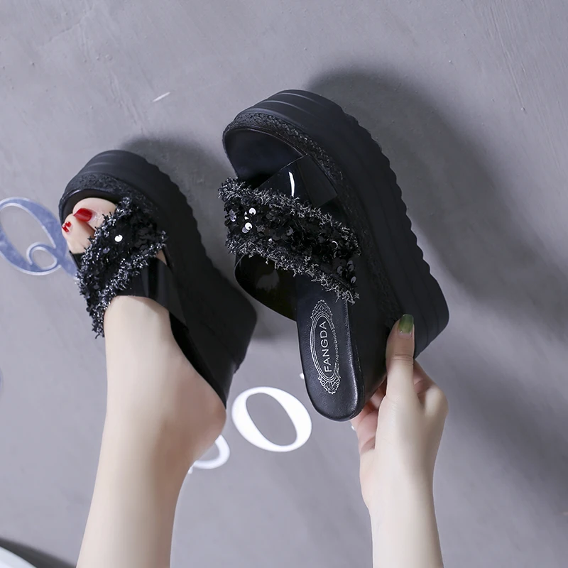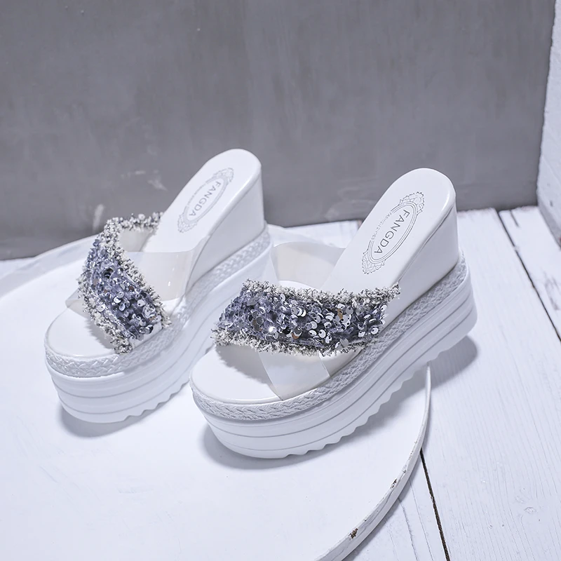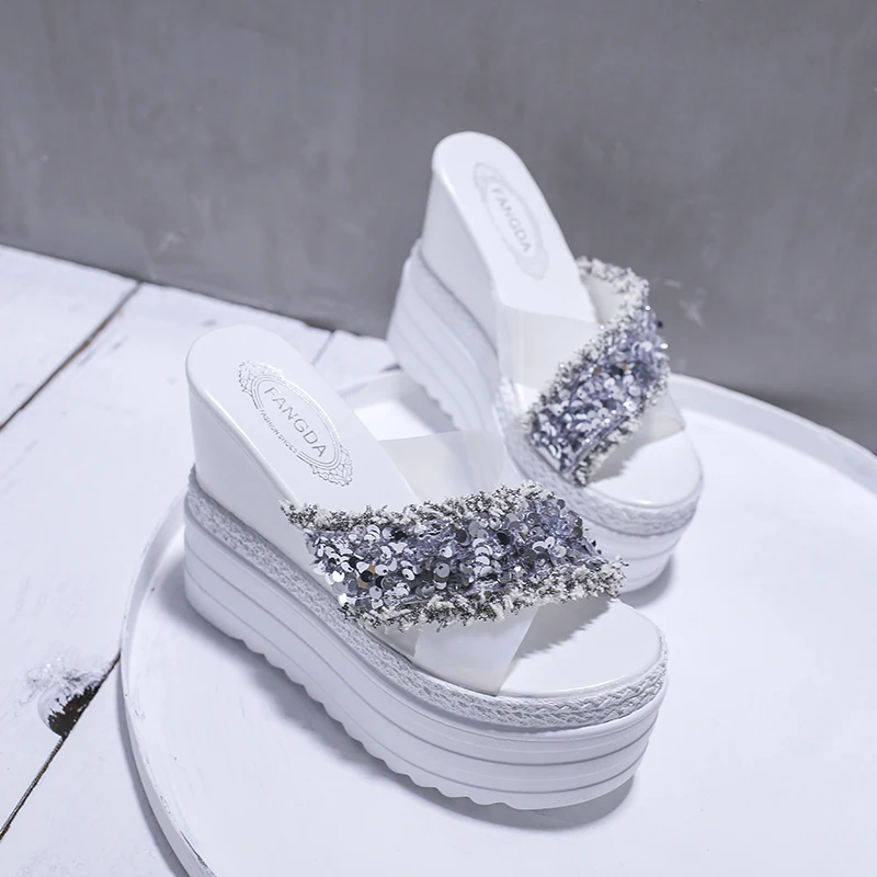 Шлепанцы с блестками; Женские босоножки на высоком каблуке; Коллекция 2021 года; Летние шлепанцы на танкетке; Женские пляжные шлепанцы с открытым носком на платформе; Шлепанцы на каблуке