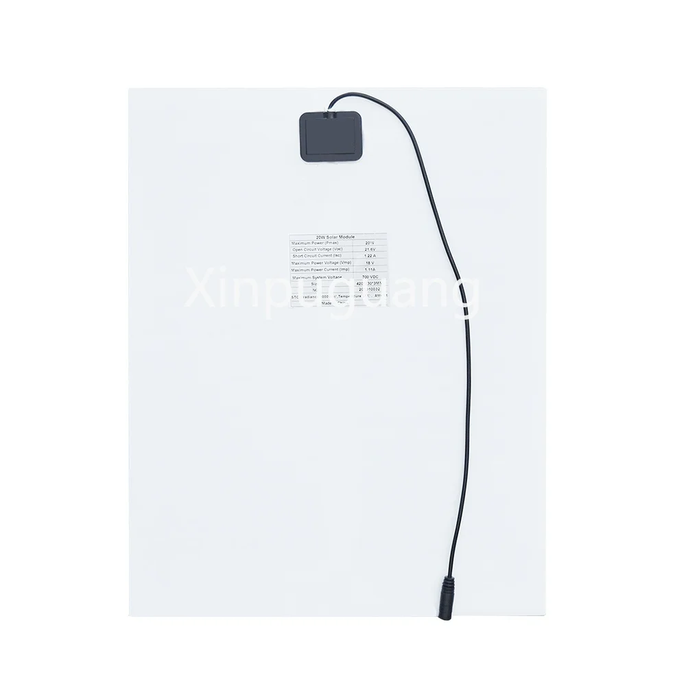 Puissance maximale (Pmax): 20WTension de circuit ouvert (Voc): 21,6 VCourant de court-circuit (Isc): 1.22ATension d'alimentation maximale (Vmp): 18VCourant d'alimentation maximal (Imp): 1.11ATension maximale du système: 700 V CCEfficacité cellulaire: 21%Nombre de cellules: 36pcsPoids: 0.49 kg; Taille: 420 * 330 * 3 mmConditions d'essai standard: rayonnement 1000w / m2, température 25 ℃, AM = 1,5