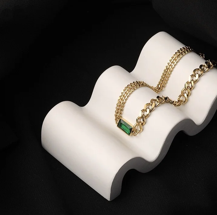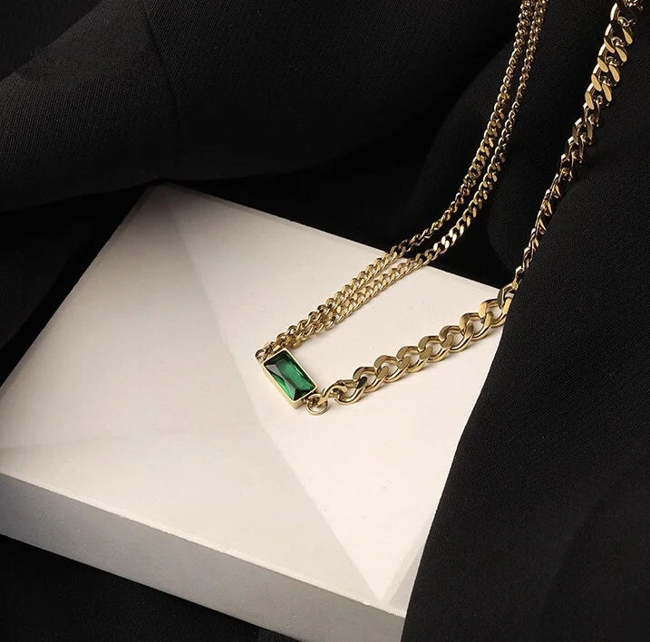 Винтажное ожерелье с зелеными бриллиантами, золотое ожерелье из нержавеющей стали, Женские Подвески, ожерелье с изумрудами, бижутерия для вечеринки, циркониевые цепочки до ключиц