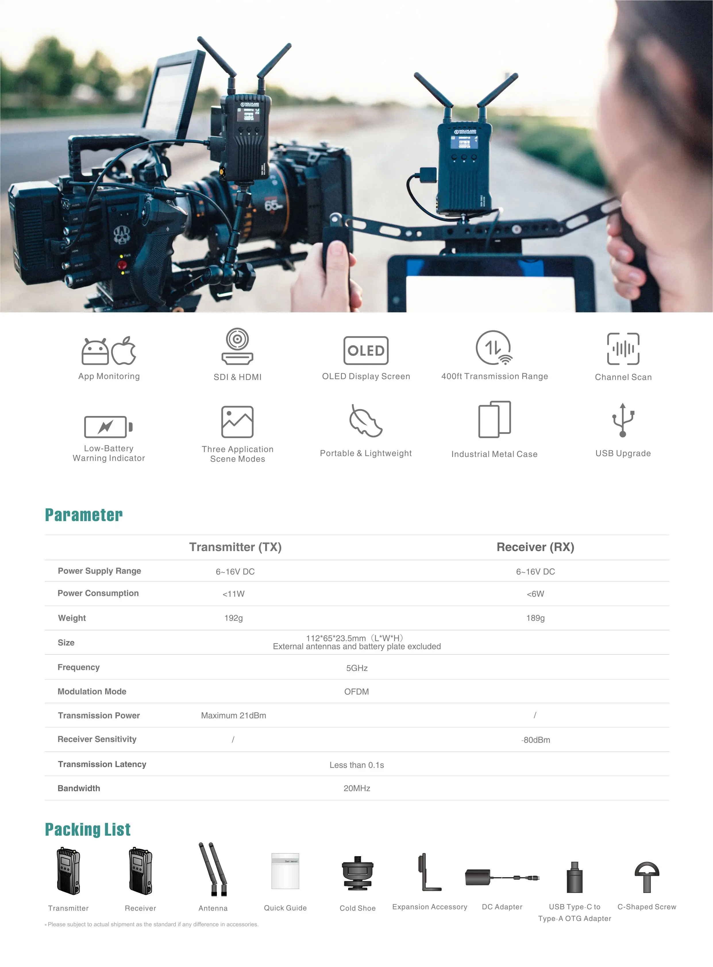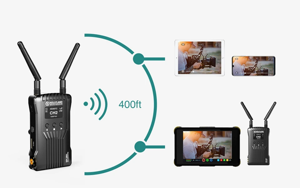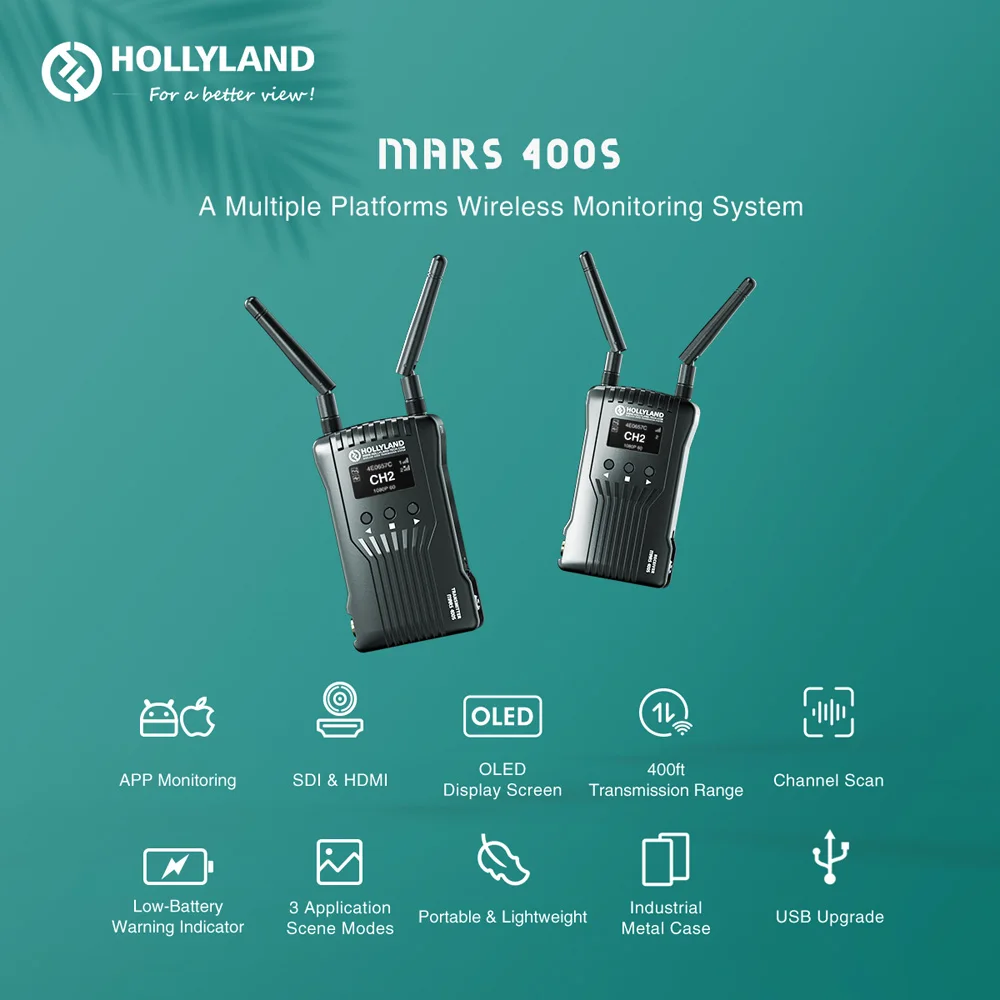 Hollyland Mars 400S Беспроводной SDI/HD видео передачи Системы использует самую последнюю кодирование изображений, технология декодирования и 5G Беспроводной технологию передачи для того чтобы обеспечить меньше, чем 0,1 s и продолжительности полового акта передачи видеосигнала, расстояние передачи составляет 400 футов в режиме видимости, а максимальное разрешение-1080P 60 Гц, что обеспечивает полную передачу видео SDI/HD.