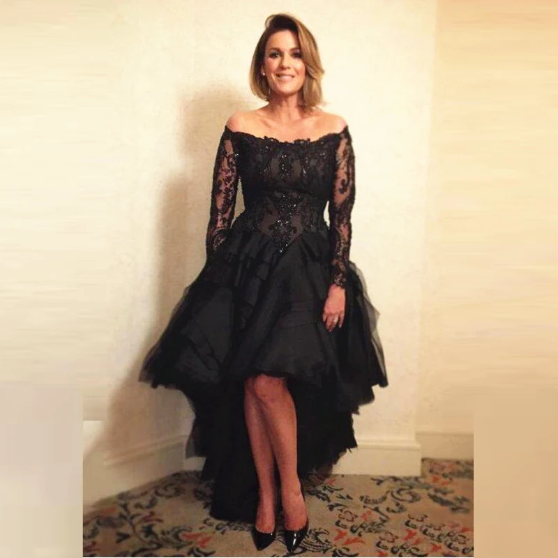 Платье для матери невесты с высоким и низким вырезом, длинное черное кружевное вечернее платье с длинным рукавом и открытыми плечами для выпускного вечера, свадьбы, вечеринки, индивидуальный пошив, большие размеры