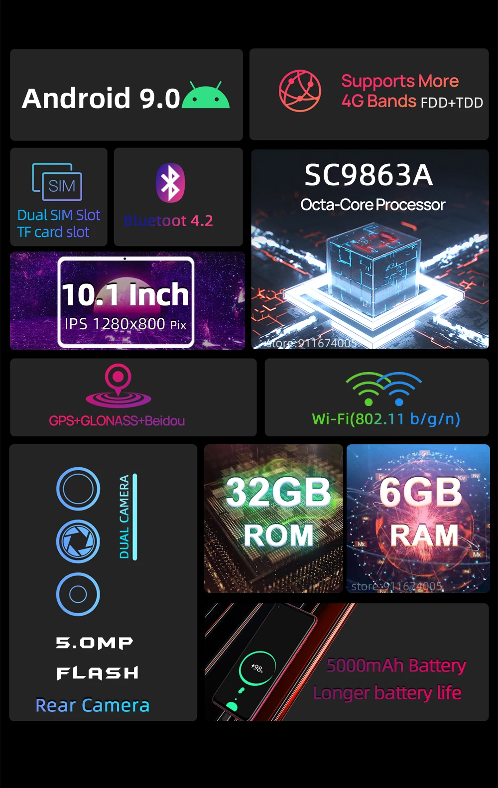 Планшет с 5,5-дюймовым дисплеем, восьмиядерным процессором Android 10,1, ОЗУ 6 + 32 ГБ, 9,0x1280, IPS, Google Store, Bluetooth, Android 9