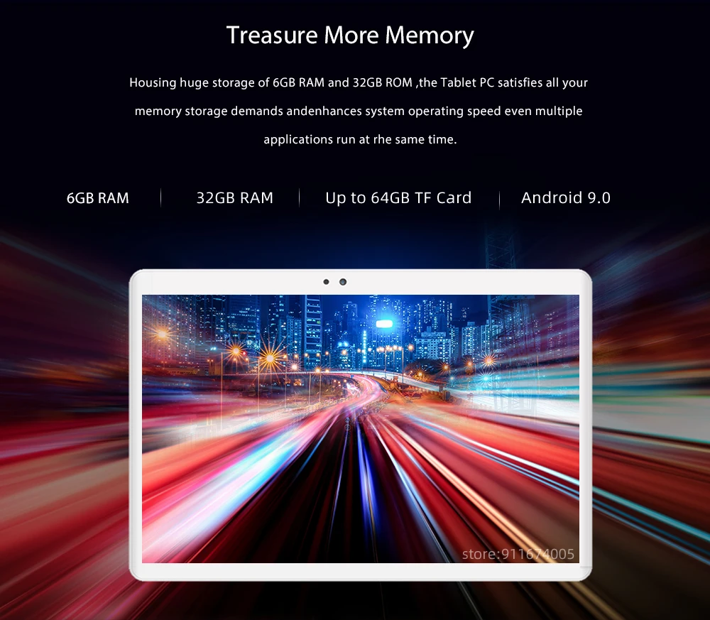 Огромное хранилище 6 ГБ ОЗУ и 32 Гб ПЗУ, планшетный ПК удовлетворит все вашиПамять требует и увеличивает скорость работы системы даже несколькоПриложения работают одновременно.