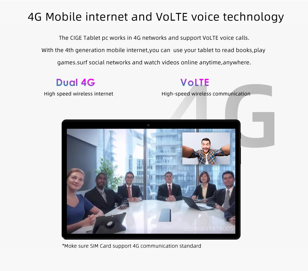 Планшетный ПК CIGE работает в сетях 4G и поддерживает голосовые вызовы VoLTE.Благодаря мобильному Интернету 4-го поколения вы можете использовать планшет для чтения книг и игрИгры. Работайте в социальных сетях и смотрите видео онлайн в любое время и в любом месте.