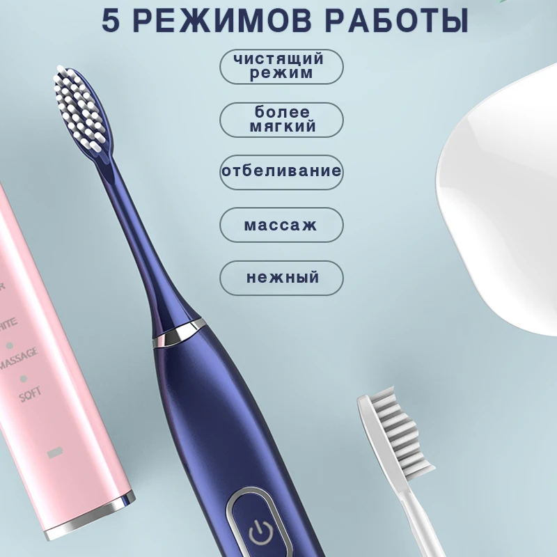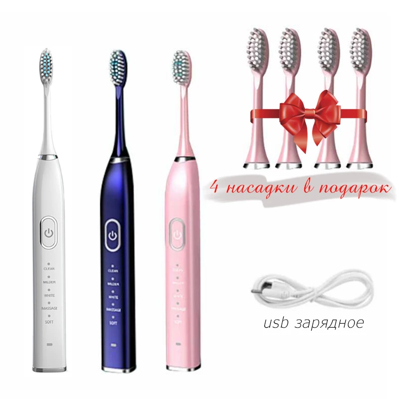 Электрическая зубная щетка с 5 сменными насадками, 5 режимов, с таймеров,USB зарядный кабель, для взрослых