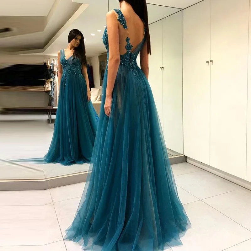 Сексуальные вечерние платья с высоким разрезом, V-образным вырезом, без рукавов, аппликацией из бисера, ТРАПЕЦИЕВИДНОЕ Тюлевое платье для вечеринки и выпускного вечера, платье до пола с открытой спиной, 2021