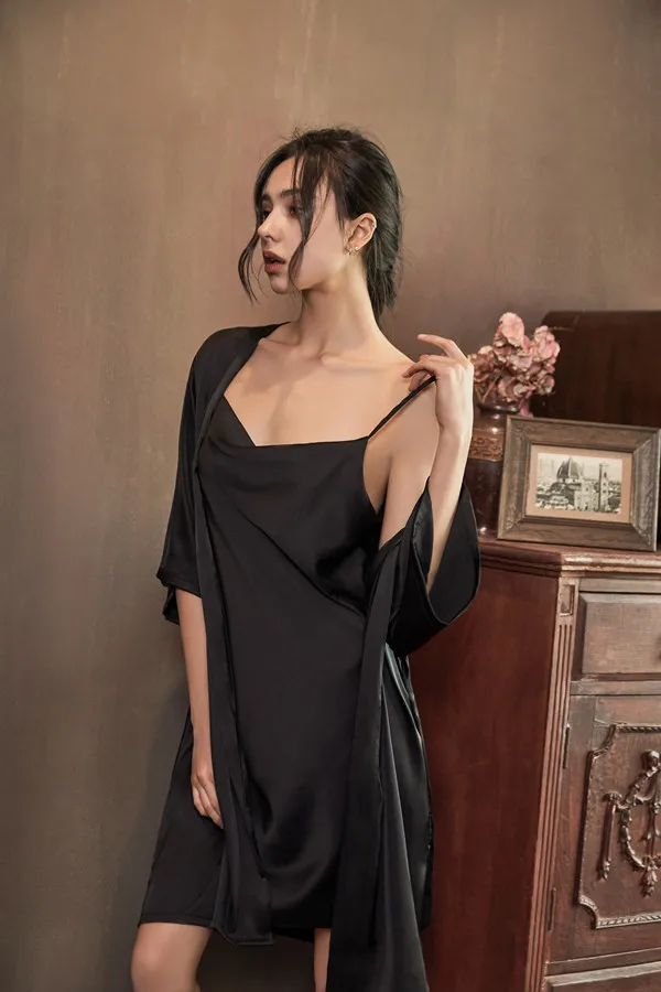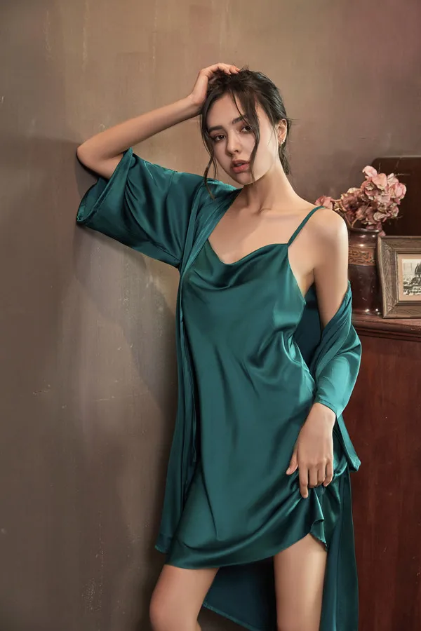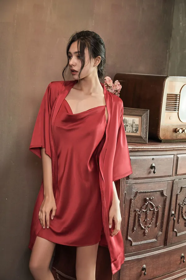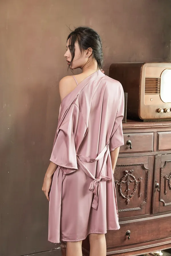 Бордовый, сексуальным вырезом на спине и мини-ночная рубашка комплект повседневная женская обувь халат-кимоно костюм Свободная ночнушка из искусственного шелка, одежда для сна, сезон: весна-лето домашнее платье