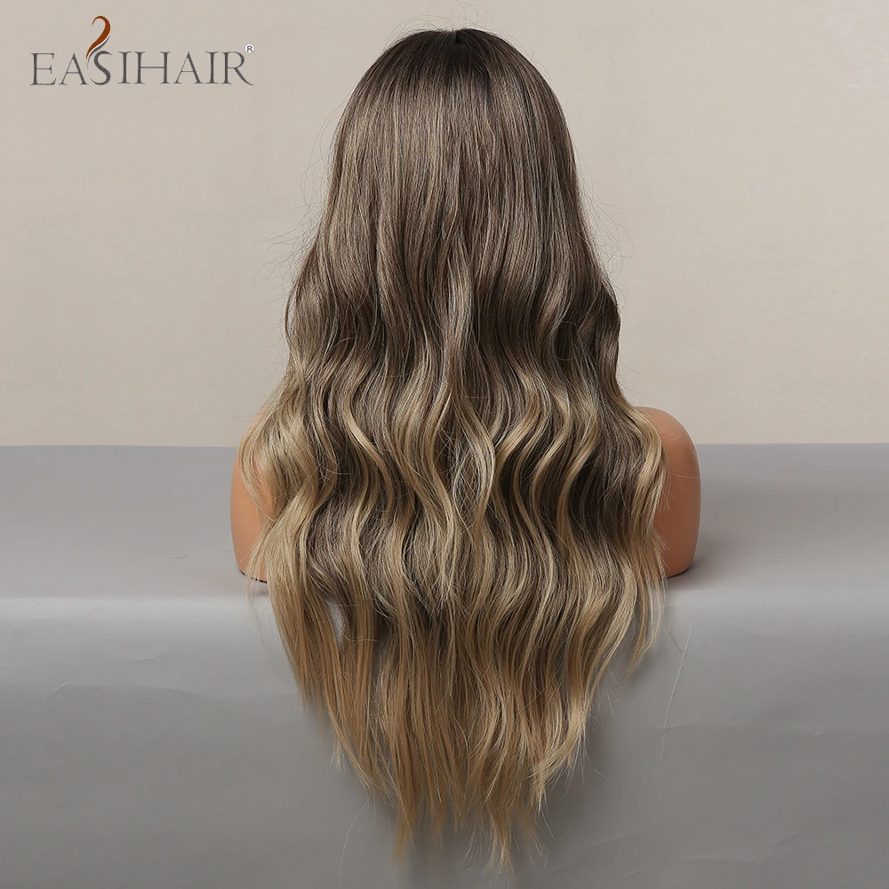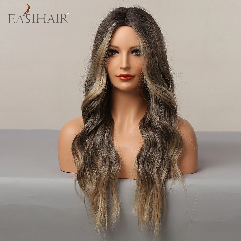 EASIHAIR Смешанные черные коричневые Синтетические длинные волнистые парики с золотыми бликами средняя часть термостойкие волосы парики для черных женщин