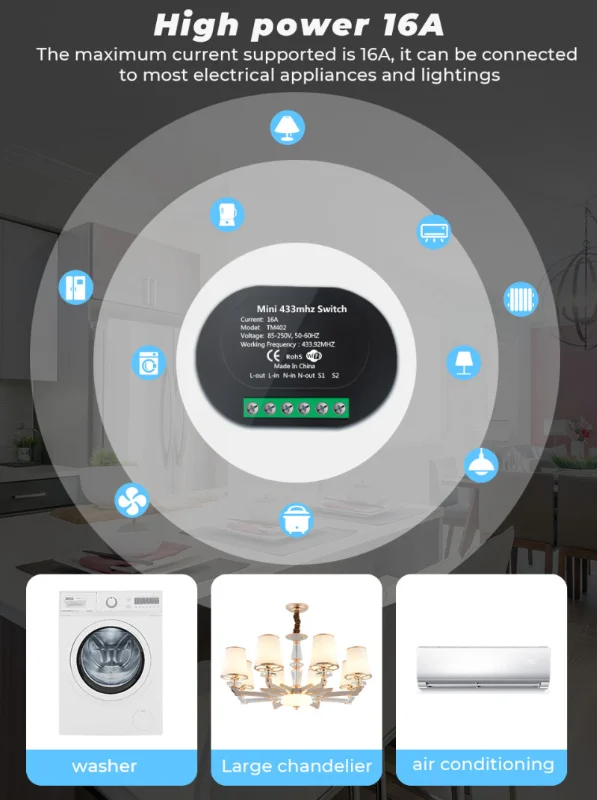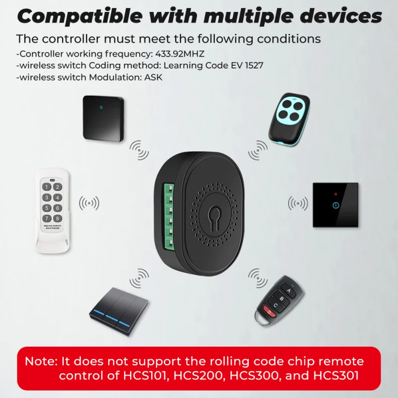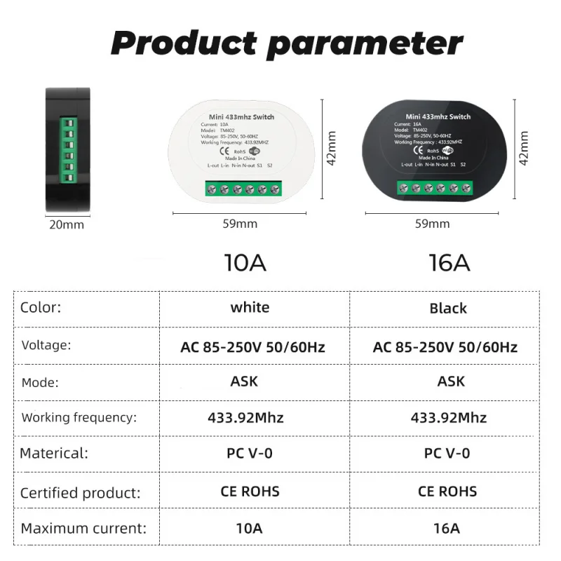 Характеристики:Напряжение: 85 ~ 250 В, 50-60 Гц ток: 16А Рабочая частота: 433,92 МГц Материал: Поликарбонат огнестойкий V0 Размер: 59x42x20 мм код обучения: EV 1527 режим: расстояние приема запроса: 100 м расстояние открытия пульт дистанционного управления совместим с чипом EV1527 2262. Не поддерживает пульт дистанционного управления HCS101, HCS200, HCS300, HCS301