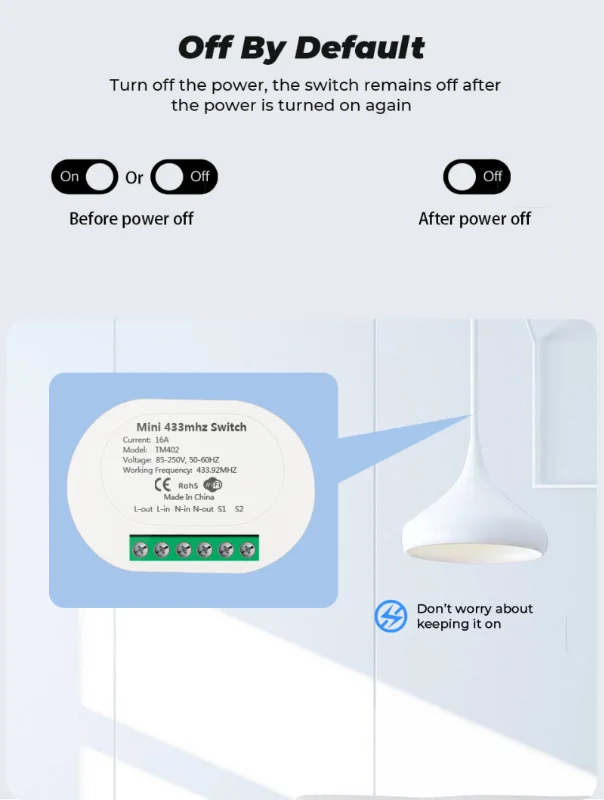 Описание:1. Функция синхронизации: не требуется Wi-Fi или приложение, может достичь 4 уровней функции синхронизации (15, 30, 45, 60 минут) 2.16A Высокая мощность: подходит для большинства устройств, безопаснее в использовании 3. Мини-Корпус: может быть непосредственно установлен в нижней коробке переключателя, Обслуживание и установка более удобны 4. Расстояние открытия 100 метров, более удобное в использовании, фактическое расстояние зависит от препятствий, чем больше препятствий, тем короче расстояние, Чем серьезнее потеря сигнала 5. После выключения питания, снова позвоните, состояние по умолчанию выключено 6. Поддержка двойного управления: можно подключить к предыдущему двухстороннему Переключатель