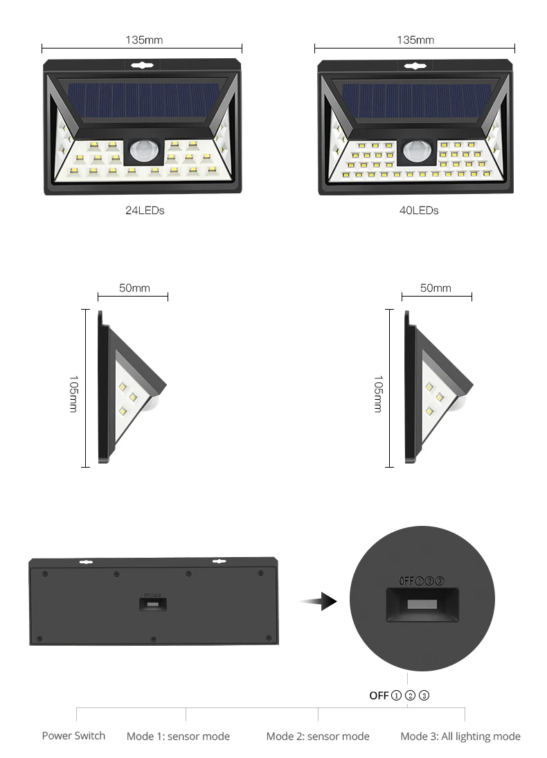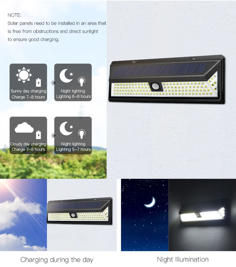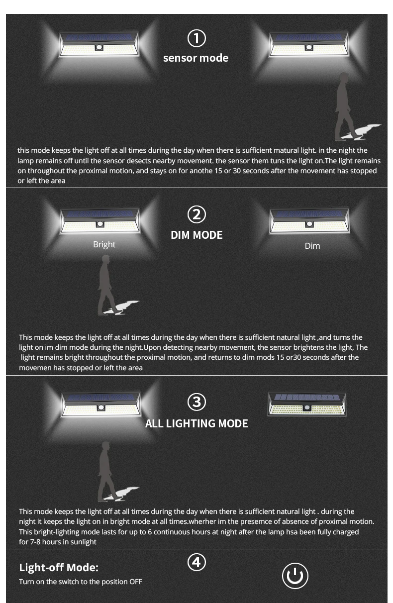 Светильник управляется датчиком движения и датчиком движения.Он может работать только в темноте.Когда люди приближаются к солнечной лампе, она включается автоматически.Когда люди уйдут через 10 секунд, Солнечная лампа выключится.Если в дневное время, даже есть движение тела. Лампа не включается.