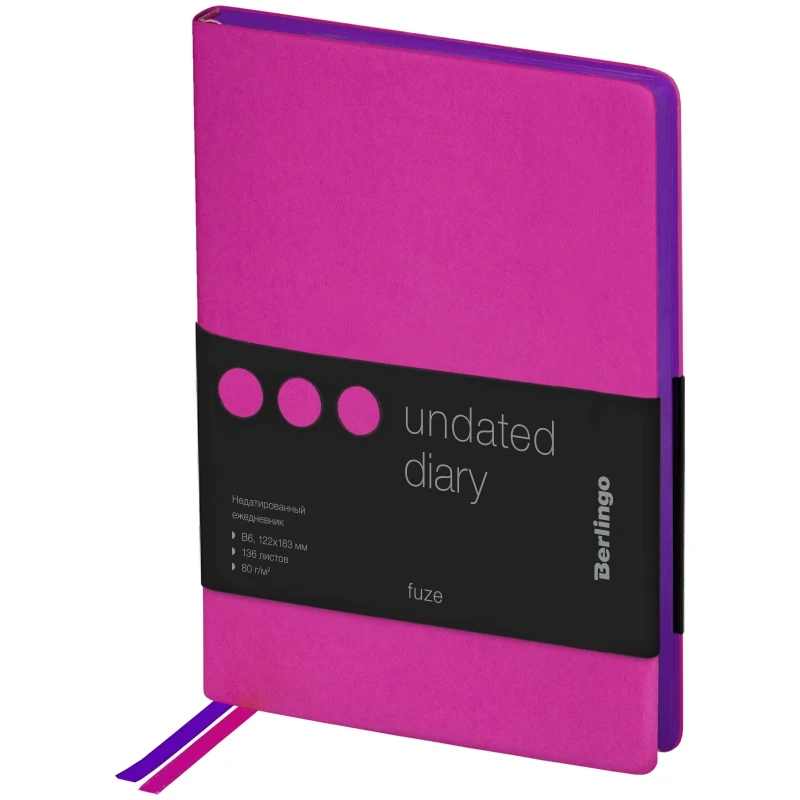Стильные ежедневники Berlingo Fuze с ярким цветным контрастным срезом и ультра-мягкой обложкой из 2 слоев высококачественного кожзаменителя. Цвет обложки - фуксия, цвет среза - фиолетовый. Внутренний блок из 136 листов высокачественной кремовой бумаги повышенной плотности 80 г/м?, пантонная печать в 2 краски, справочный материал. Перфорированные уголки блока. 2 закладки-ляссе. Отрывные заметки и бланки извещения о ДТП. Прошитый блок. Обработанные в цвет края обложки. Подходит под персонализацию. В подарок 3 комплекта стикеров.