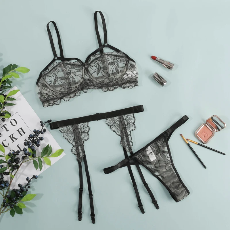 Женское нижнее белье с вышивкой, сексуальные эротические комплекты нижнего белья, прозрачное кружевное женское нижнее белье, комплект из 3 предметов: бюстгальтер пуш-ап, подвязки и стринги